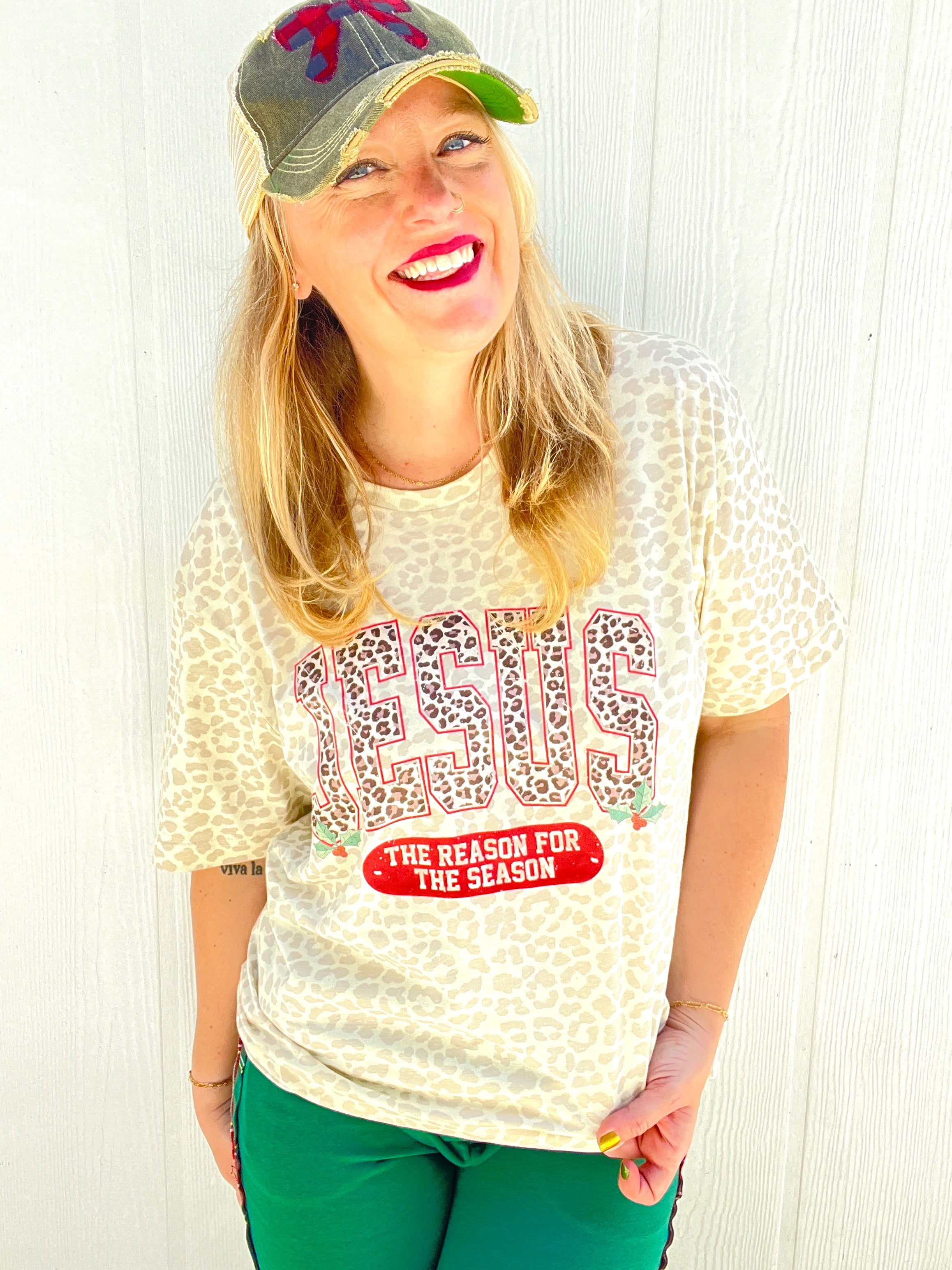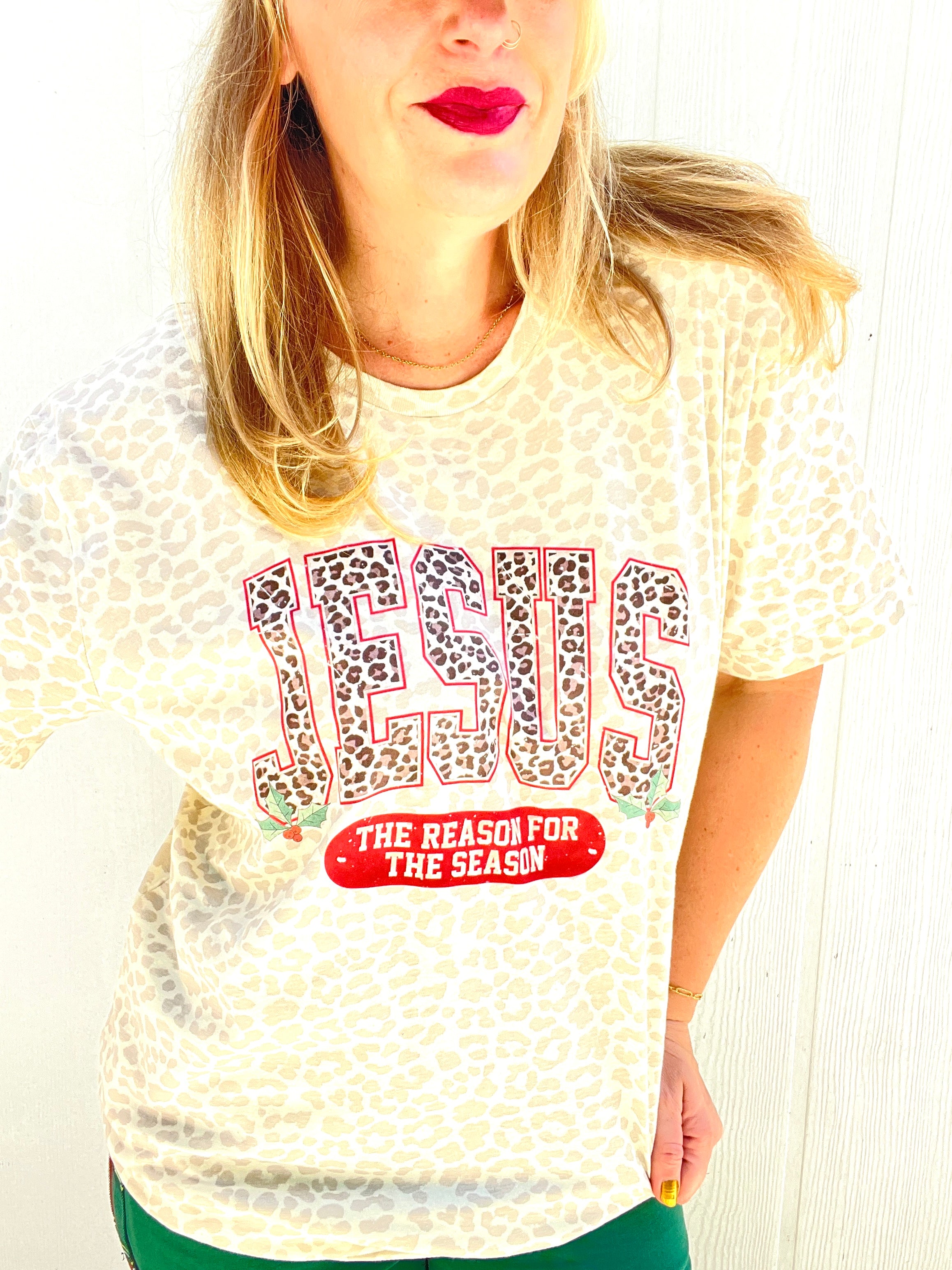 Show the world your faith with our Jesus Reason Tee. This leopard print tee features a bold statement, reminding us that Jesus is the reason for our lives. Made with high-quality material, it will quickly become a favorite in your wardrobe. Perfect for everyday wear or as a statement piece.