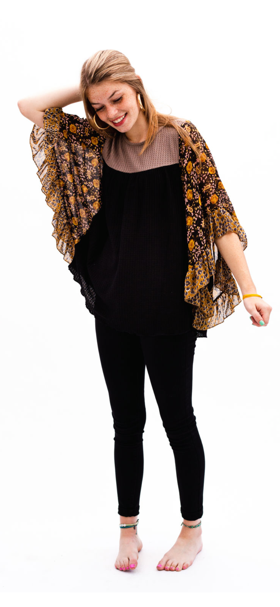 Best Features: Dolman sleeve, floral prints, waffle yolk knit, scoop hem, ruffle details on sleeves, fall/spring color tones, light-weight, flowy & flattering fit.