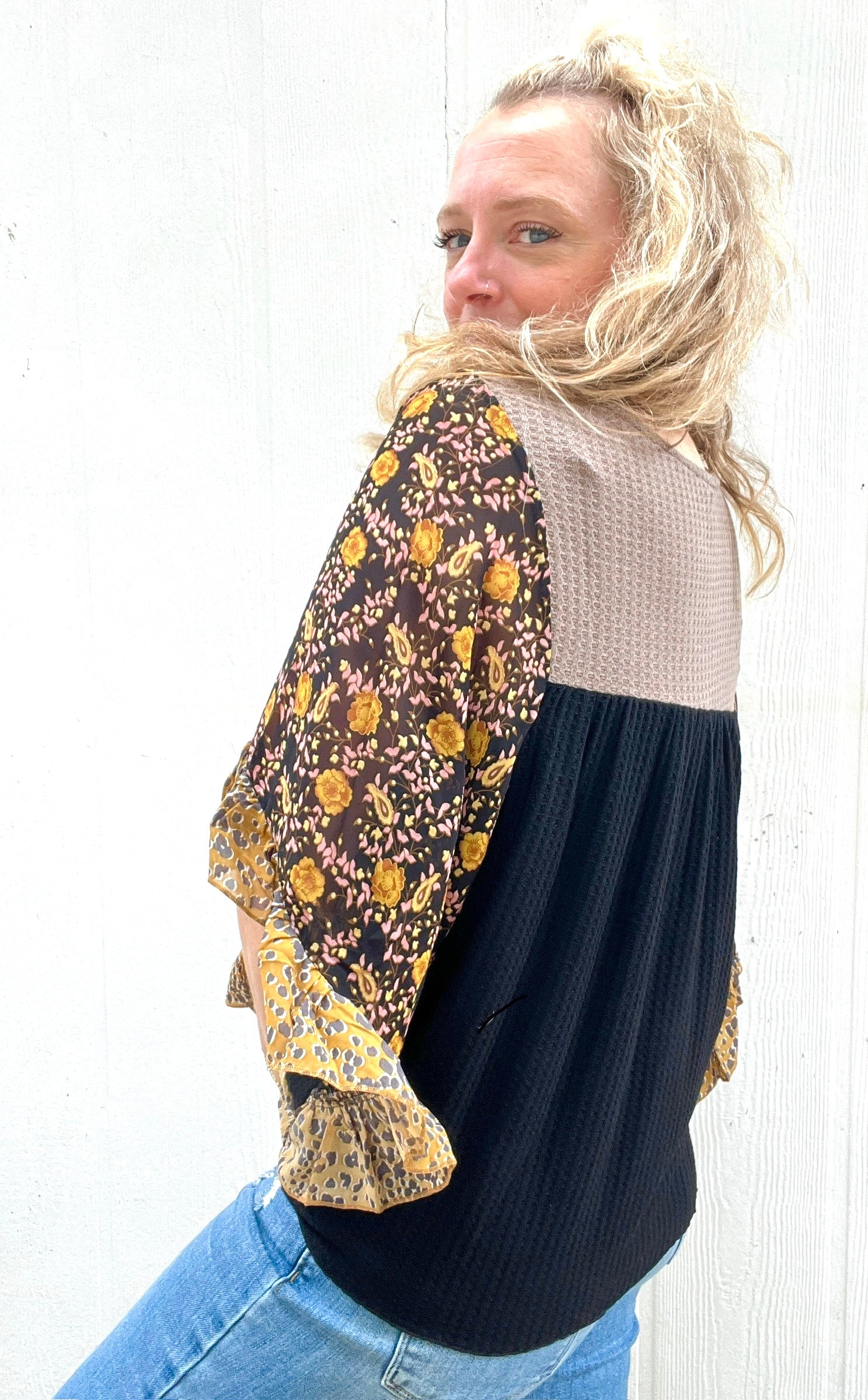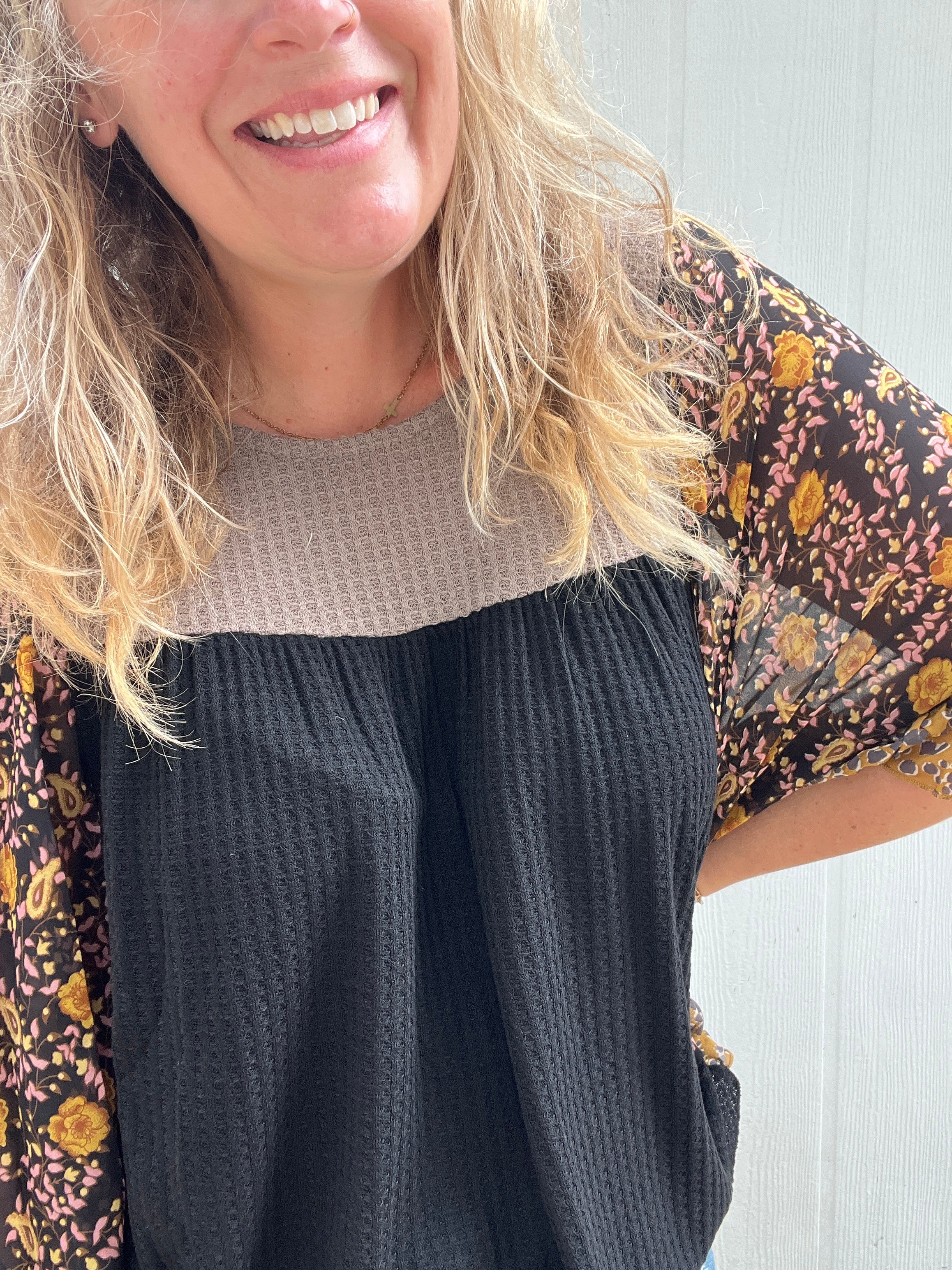 The ever classic Fair Oaks Floral Mix Top is our favorite print mixed with our favorite fabric! She looks good dressed up for that date night, a night out dancing, a concert, or even a night out strolling the town.