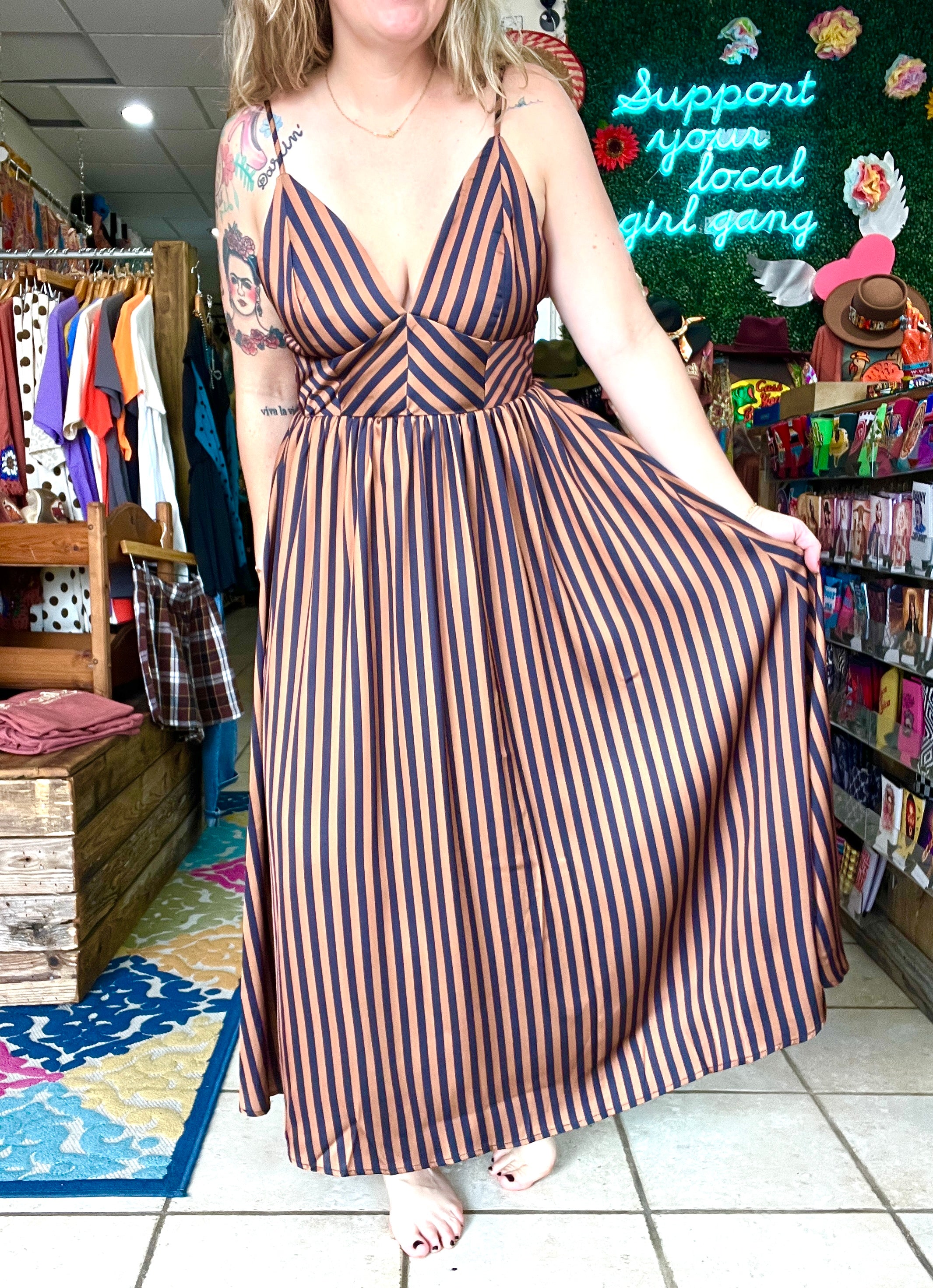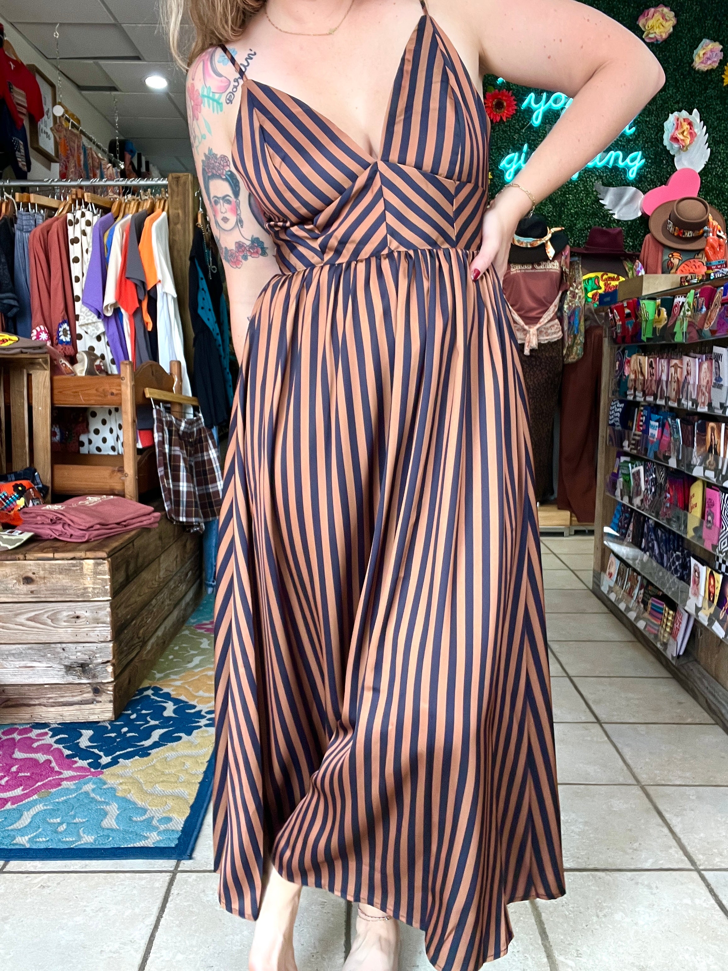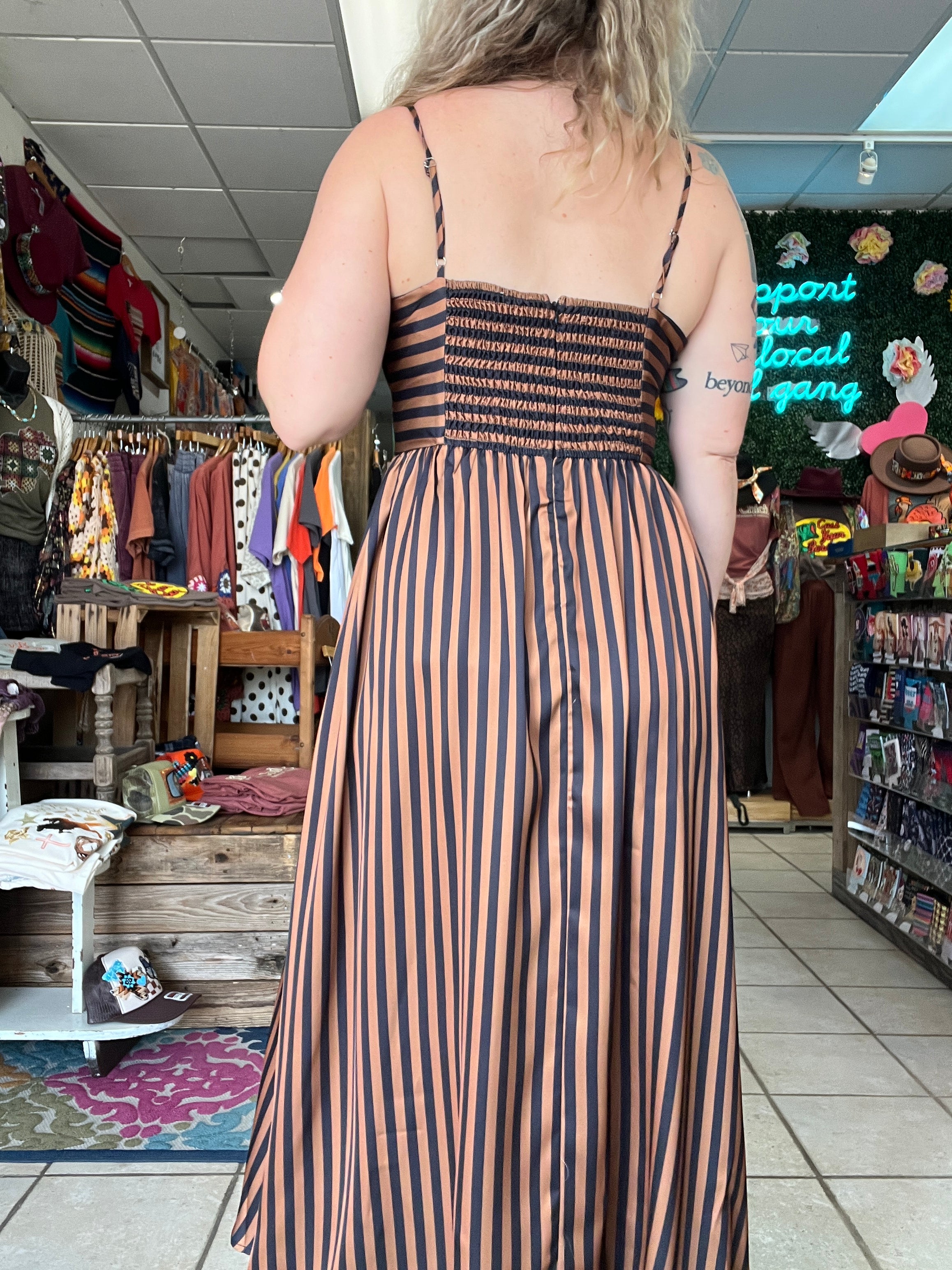 Turn heads in the effortlessly elegant Mocha Muse Slip Dress. Designed in a silky black and brown striped fabric, this dress drapes beautifully with a soft sheen that catches the light just right. Its fluid silhouette flatters every figure, while the lightweight feel makes it perfect for layering or wearing solo. Whether you’re dressing it up with heels for a night out or keeping it casual with boots and a jacket, this slip dress brings an elevated touch of fall sophistication to your wardrobe.