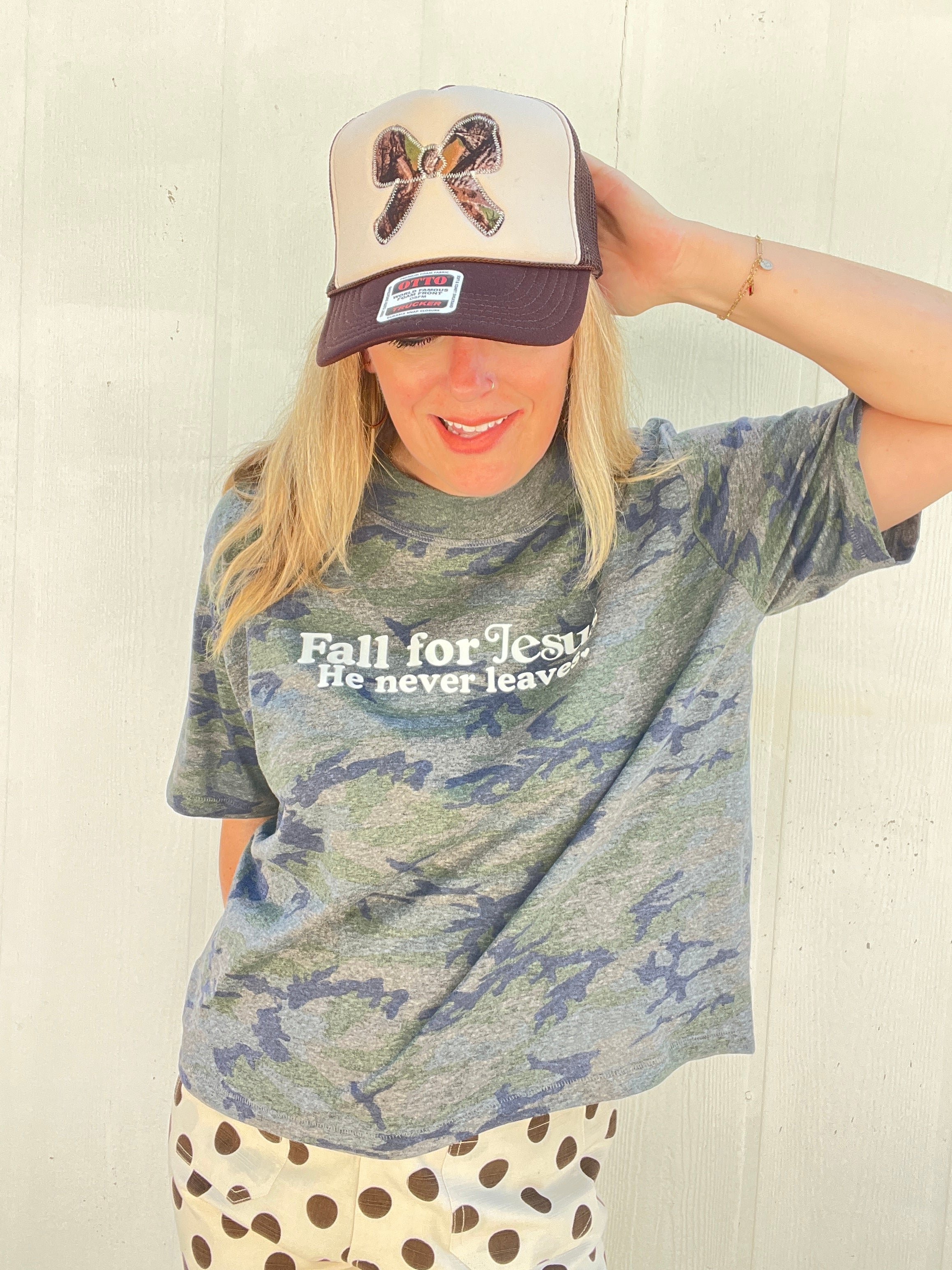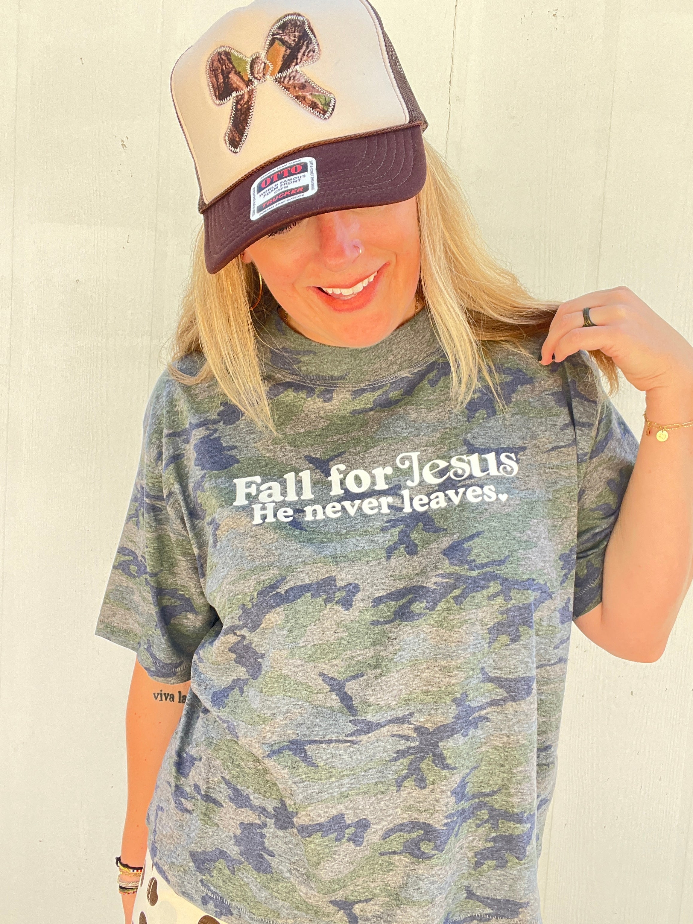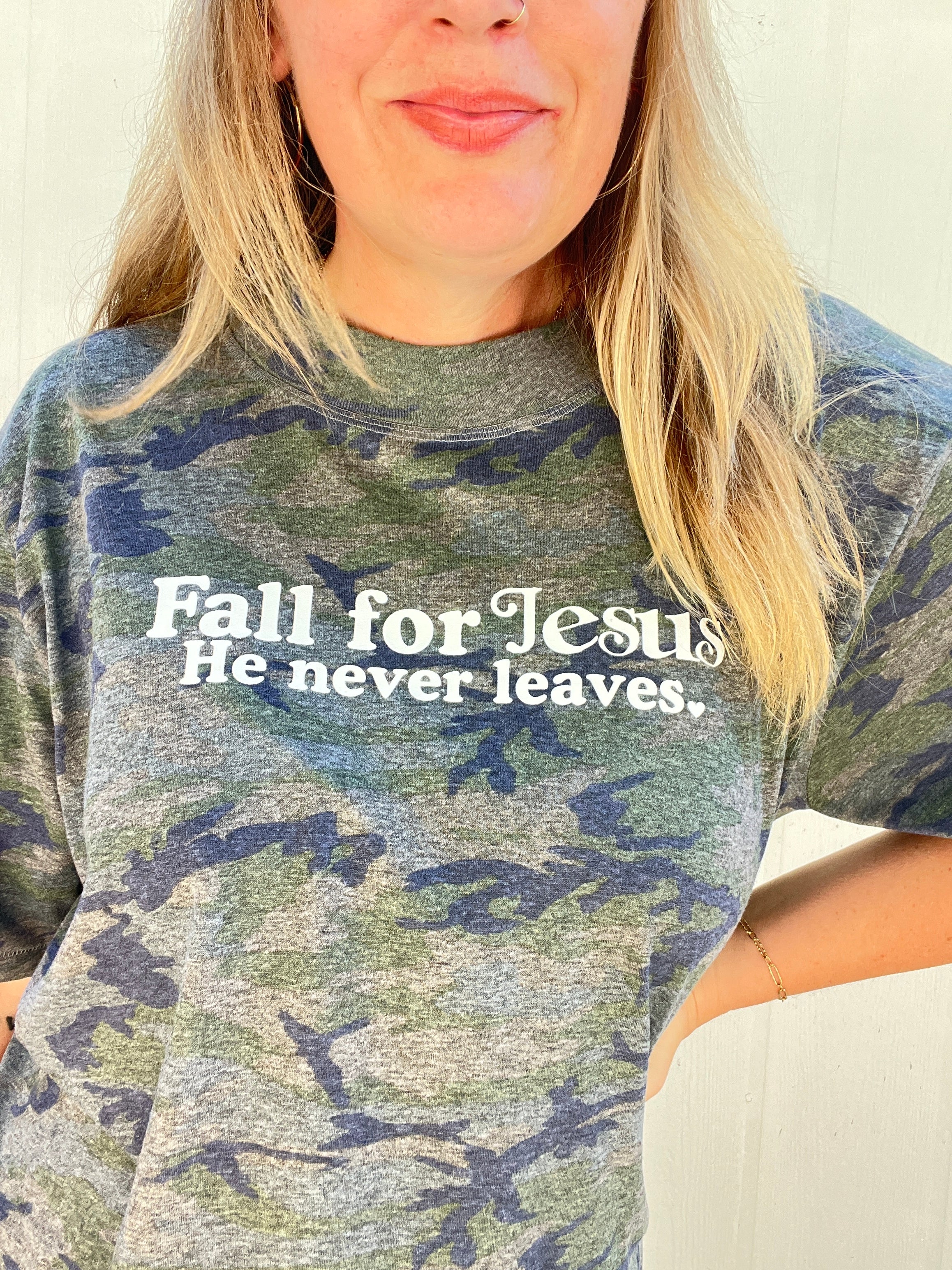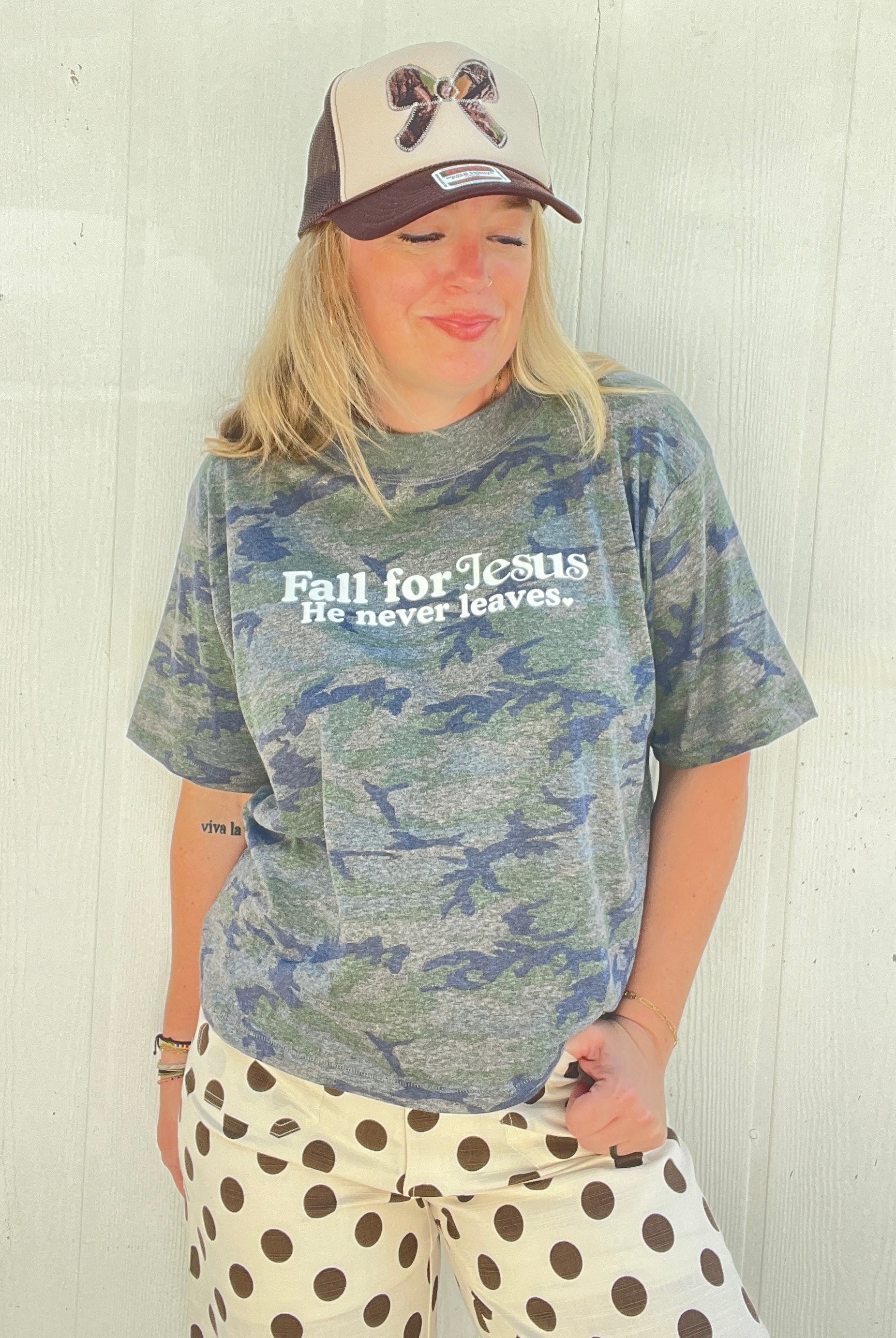 Keep your style cute and your faith front and center in our Fall for Jesus, He Never Leaves cropped tee. Designed in a soft camo print, this cropped graphic shirt blends autumn vibes with an inspiring message. Its easy, relaxed fit pairs perfectly with high-rise jeans, joggers, or leggings, making it a go-to piece for everything from pumpkin patch days to Sunday coffee runs. A must-have for the season, this tee reminds everyone of the true reason to fall.