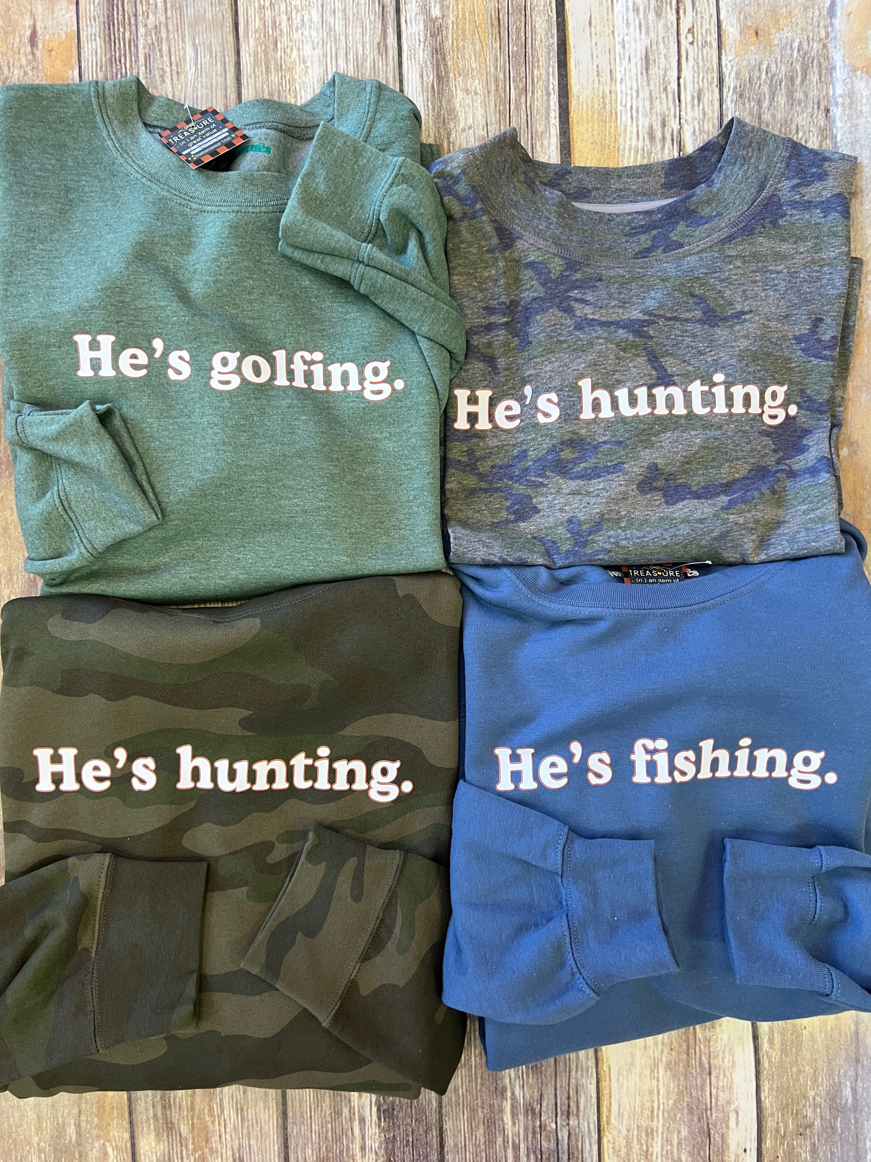 The He’s Not Here Pullover lets everyone know exactly where he is—whether he’s golfing, fishing, or hunting—so you don’t have to answer that question. Crafted for comfort and style, this custom color sweatshirt keeps him cozy while enjoying his favorite outdoor activities. Perfect for those who love their guy and it’s a simple way to share his plans without saying a word.