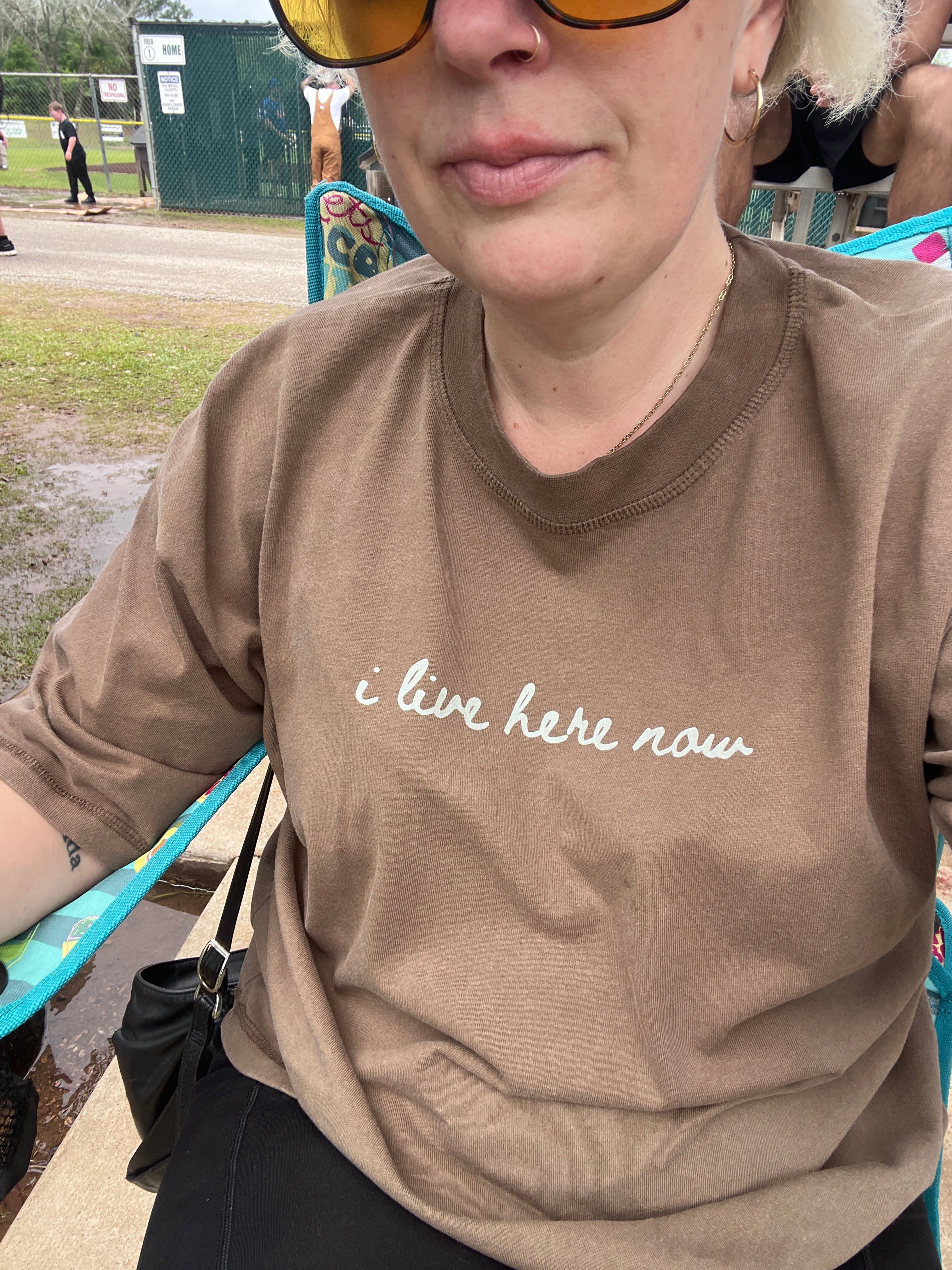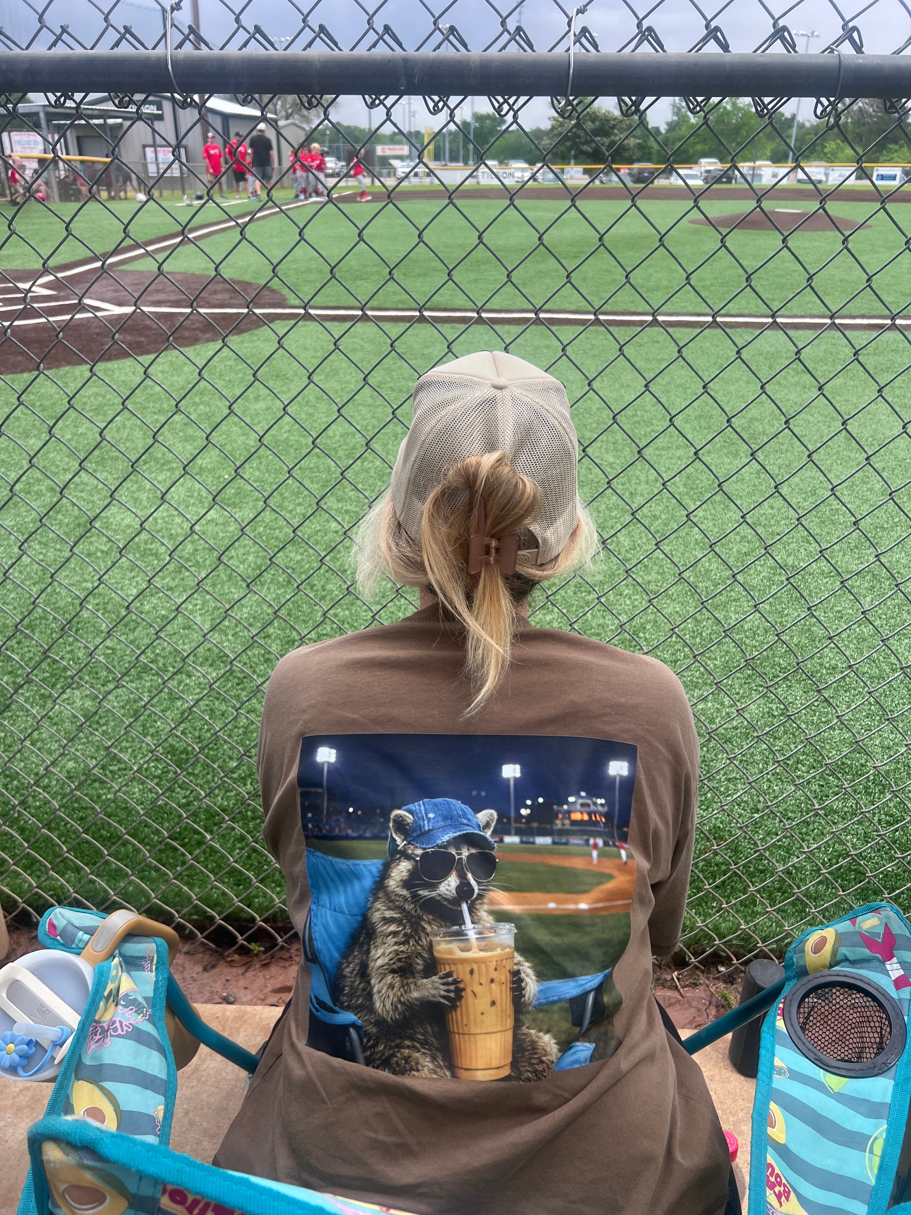 Consider this your official uniform for chaotic comfort 🦝☕️ Our oversized boxy tee features a rich brown base with a playful front graphic that reads “I Live Here Now”—because honestly… same. But the real moment is on the back: a raccoon posted up in a stadium seat, iced coffee in hand, fully embracing its new home.