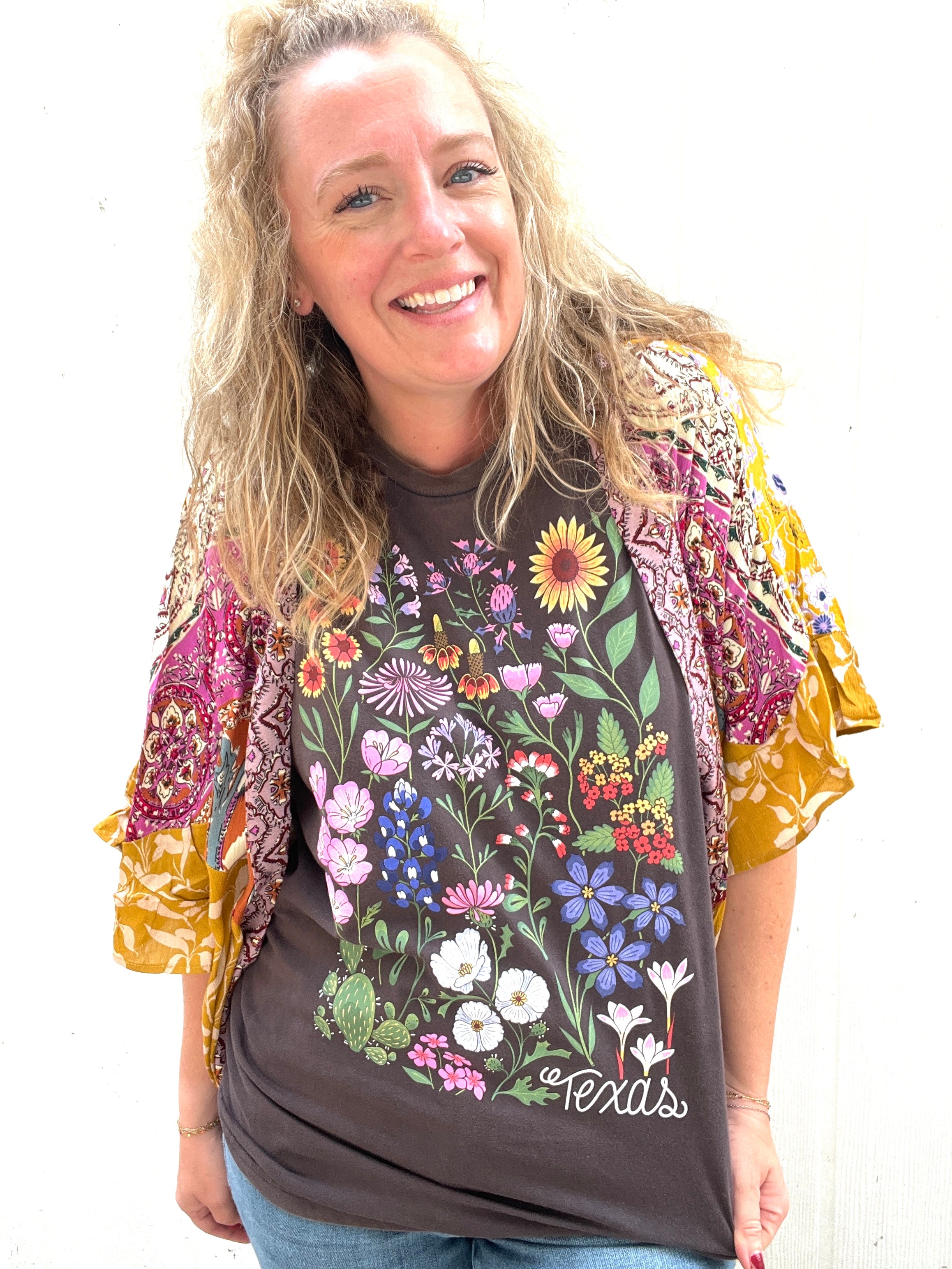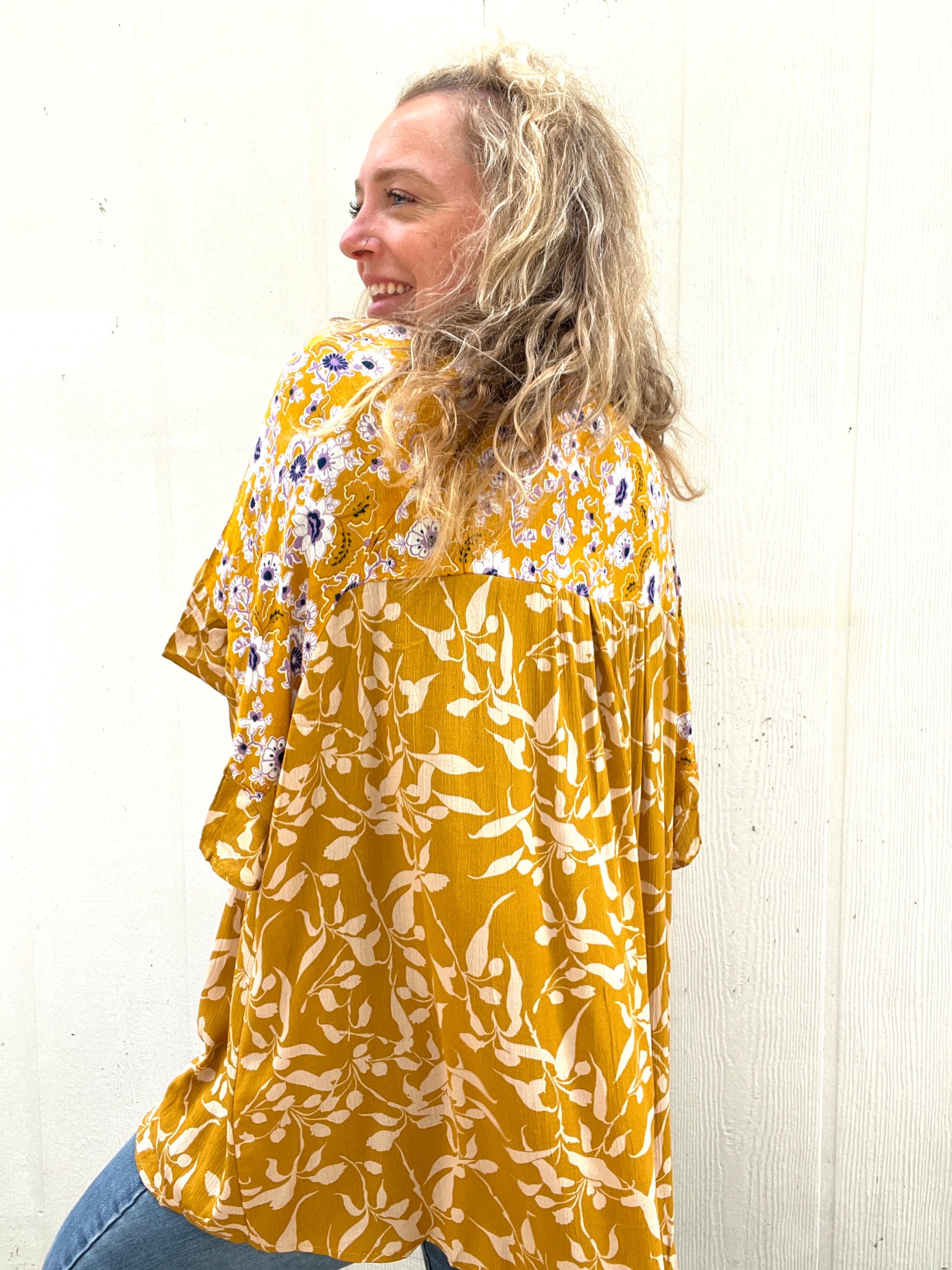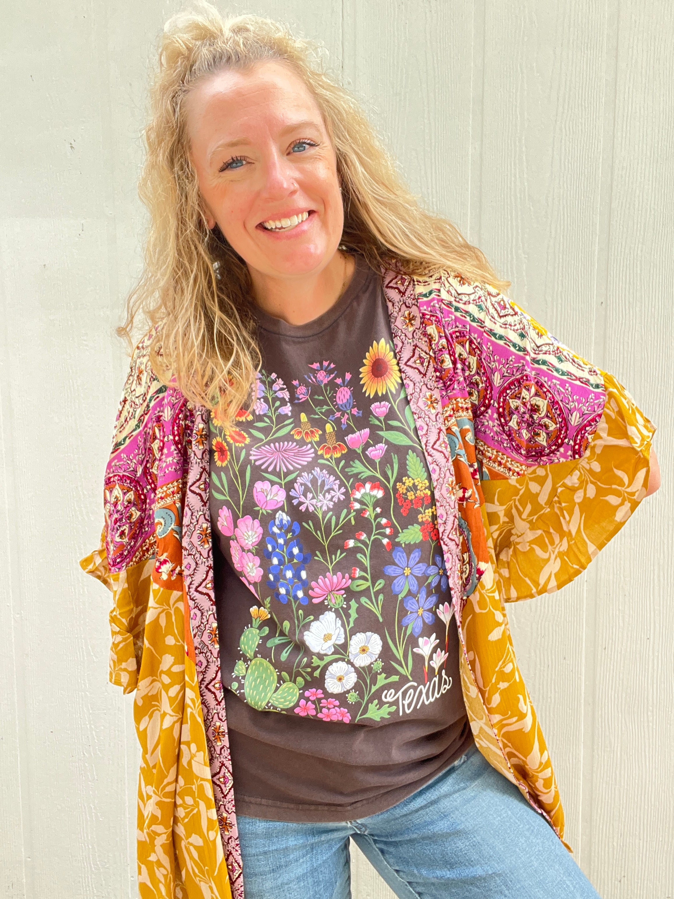 Flow into fall with the Golden Gypsy Floral Kimono, a boho beauty bursting with color and charm. This lightweight ruffle kimono features a dreamy floral print in rich mustard and vibrant fuchsia tones, perfect for layering over your favorite tanks, dresses, or denim. With its flowy silhouette and soft drape, it adds that effortless free-spirited touch to any outfit. Whether you’re strolling a fall market or dressing up for a weekend getaway, this kimono brings golden-hour magic to every moment. 🍂✨
