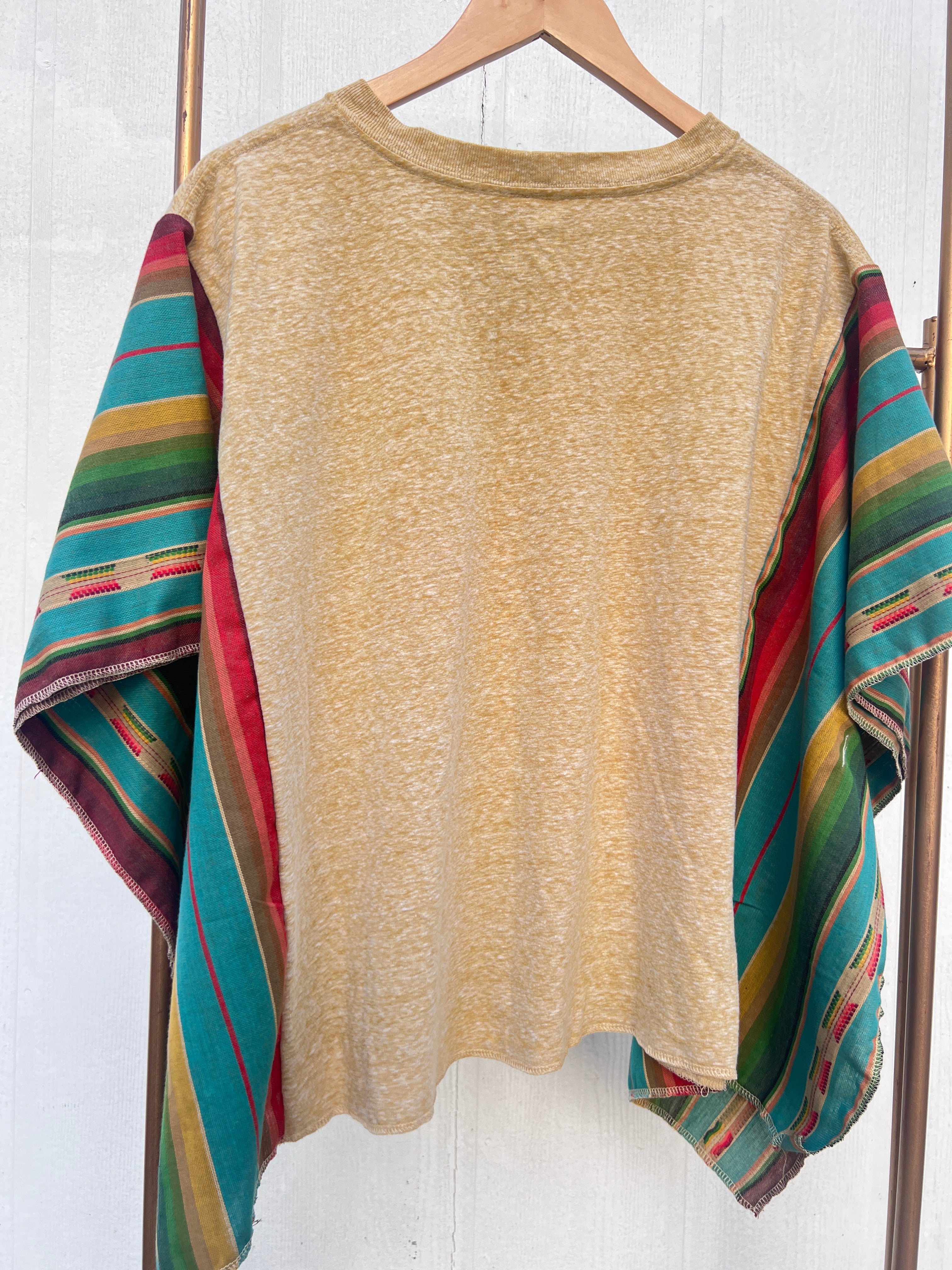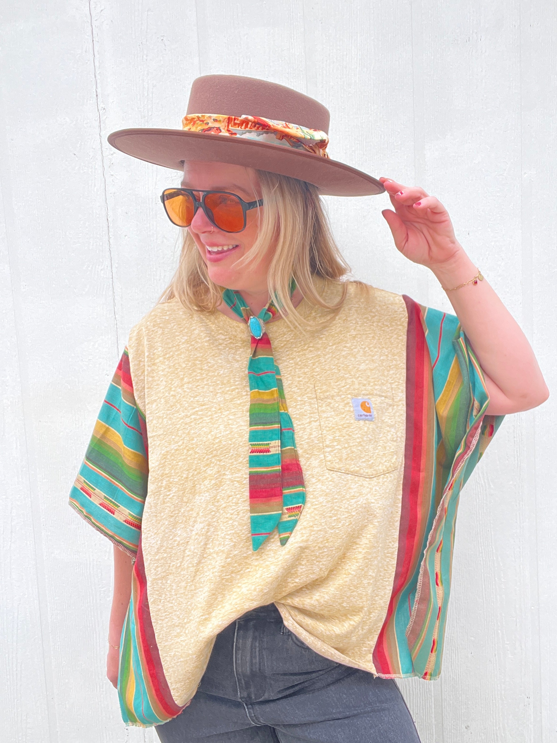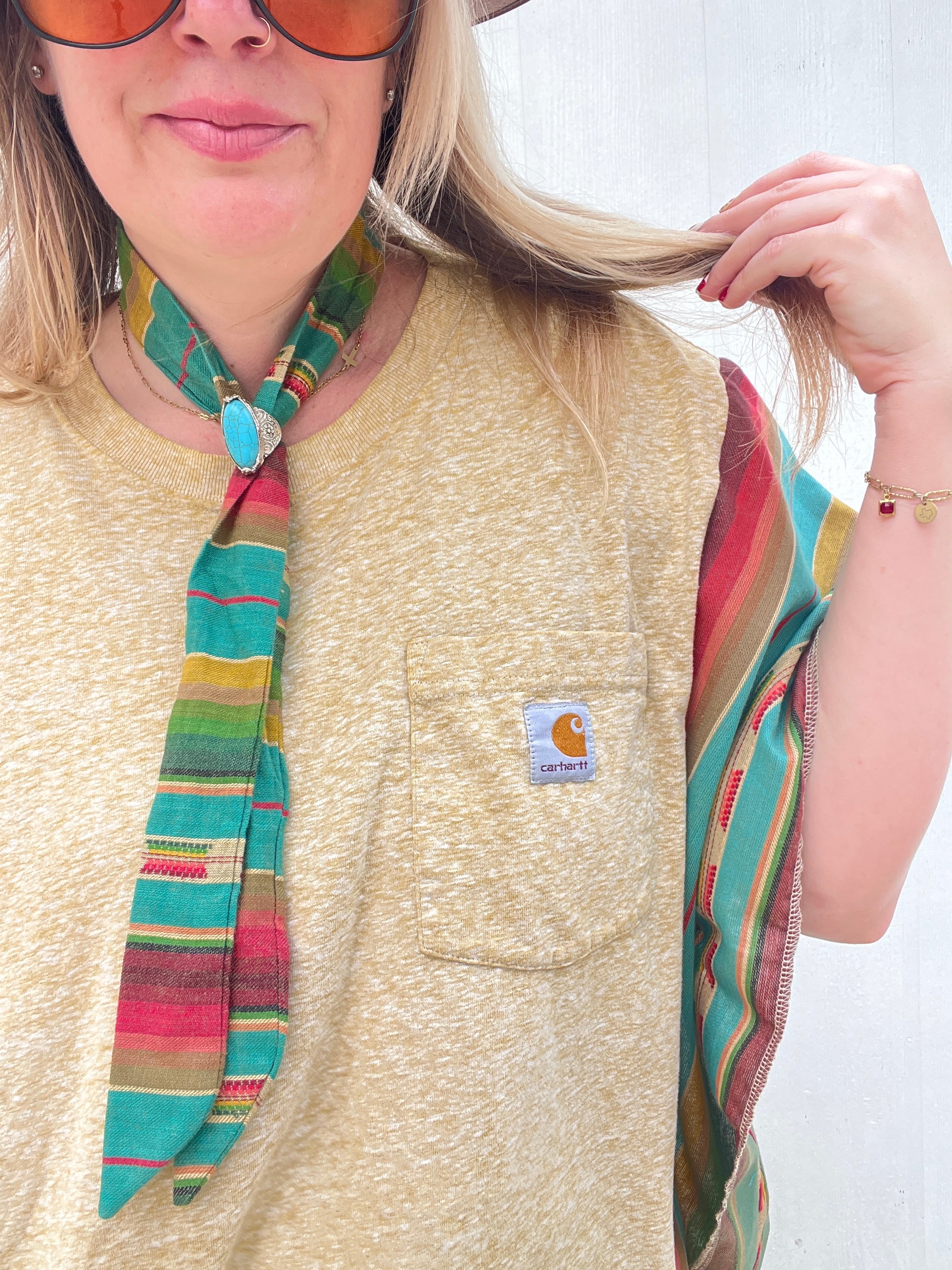 Made from: Pre-loved Men's XL Tall Carhartt Heather Mustard pocket tee curated with our Lago serape fabric kimono sleeves, finished with a serged edge