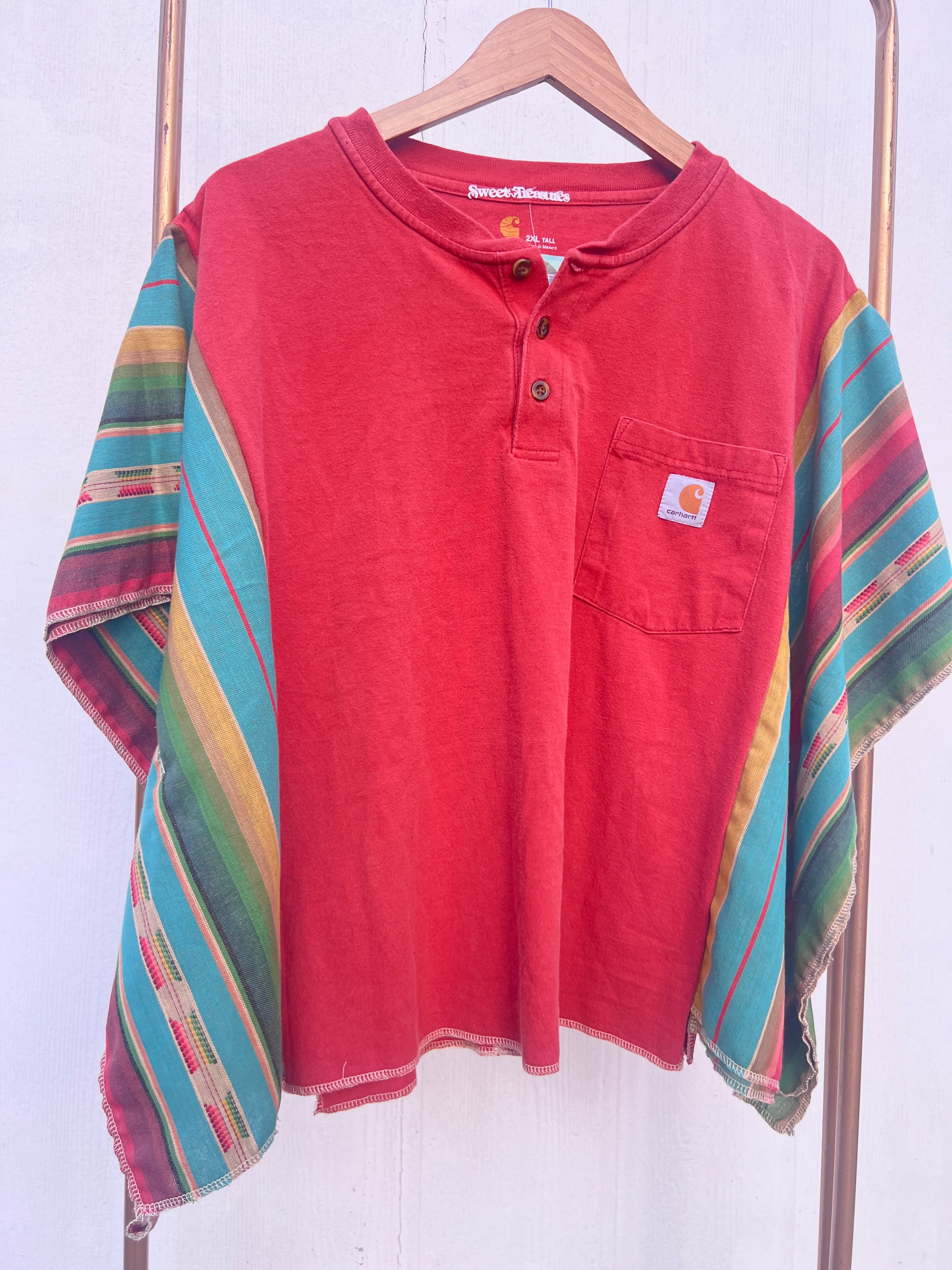 Made from: Pre-loved Men's 2XL Tall Carhartt Rust Henley tee curated with our Lago serape fabric kimono sleeves, finished with a serged edge