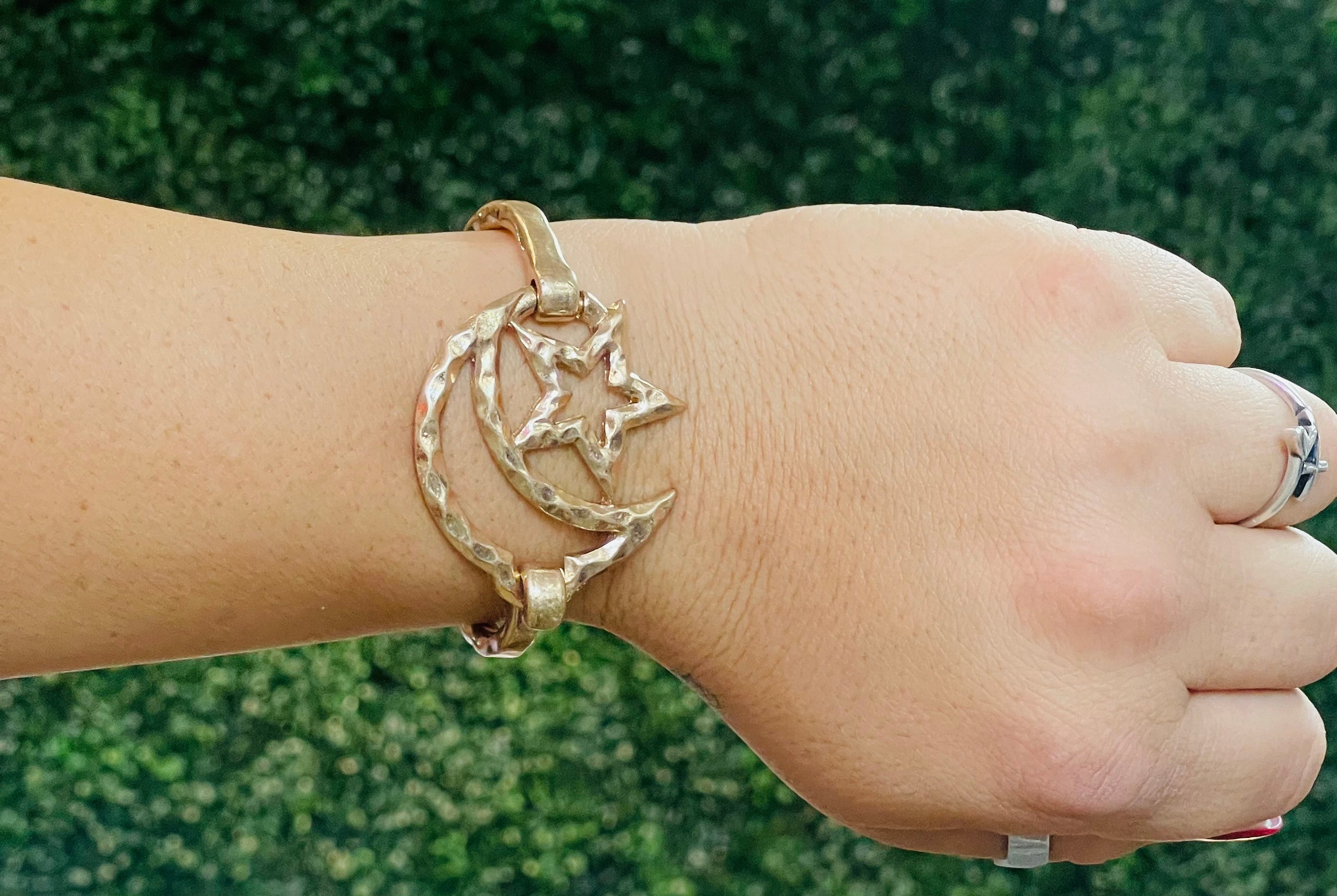 Elevate your everyday style with this elegant Bangle Bracelet. Designed with a sleek mix of either silver or gold, this piece beautifully blends modern minimalism with timeless beauty. The delicate moon and star detail serves as a subtle yet meaningful reminder of light when their is darkness, making it perfect for daily wear or as a thoughtful gift. Lightweight, versatile, and effortlessly chic, this bracelet pairs seamlessly with any outfit — from casual to dressy.