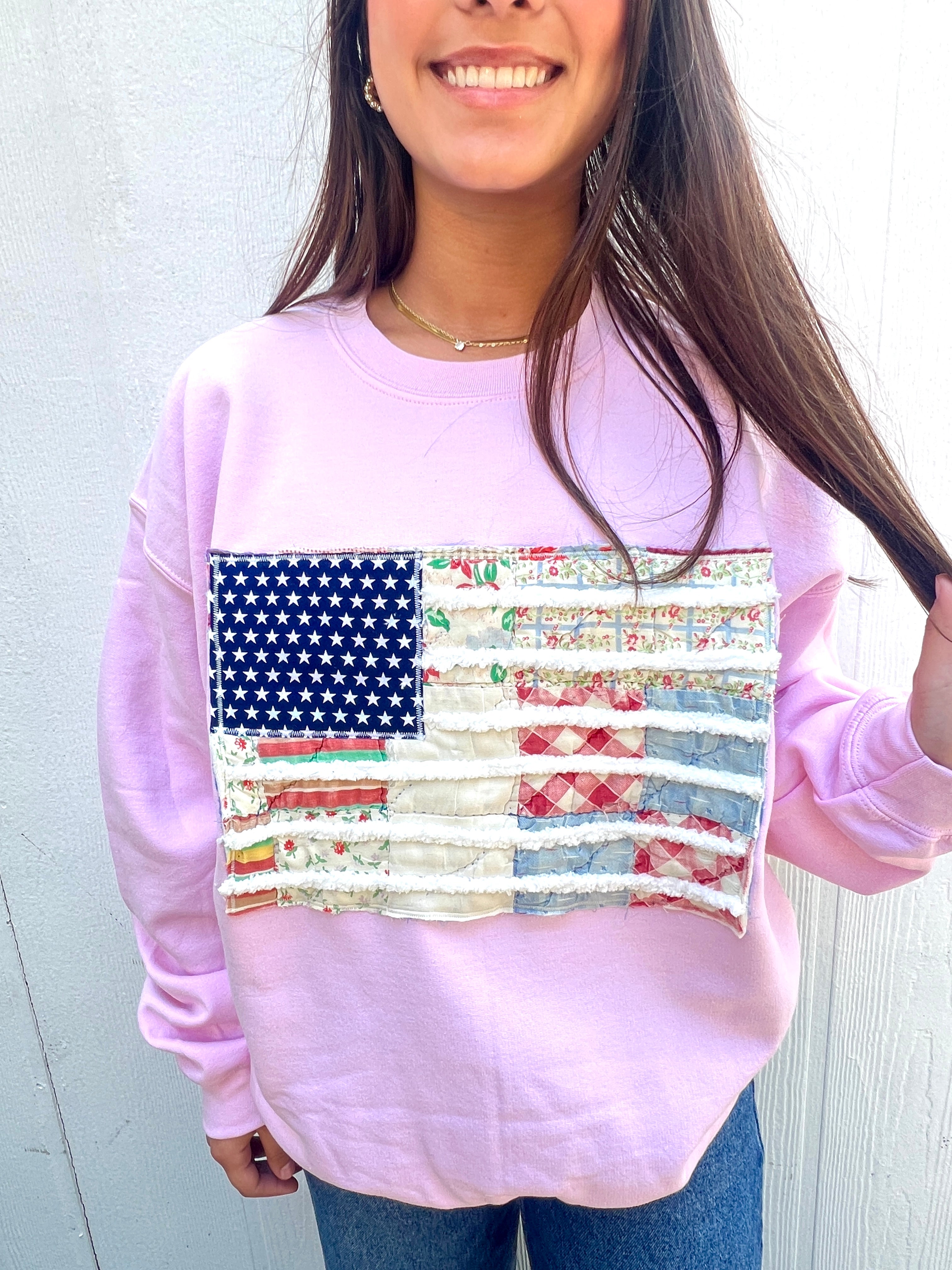 Stay cozy and stylish with the True Treasure USA Flag Quilt Pullover. Made with USA flag Americana quilt yarn, this pullover not only keeps you warm, but also shows off your patriotic spirit. Perfect for chilly nights or casual outings, it's a must-have addition to your wardrobe.