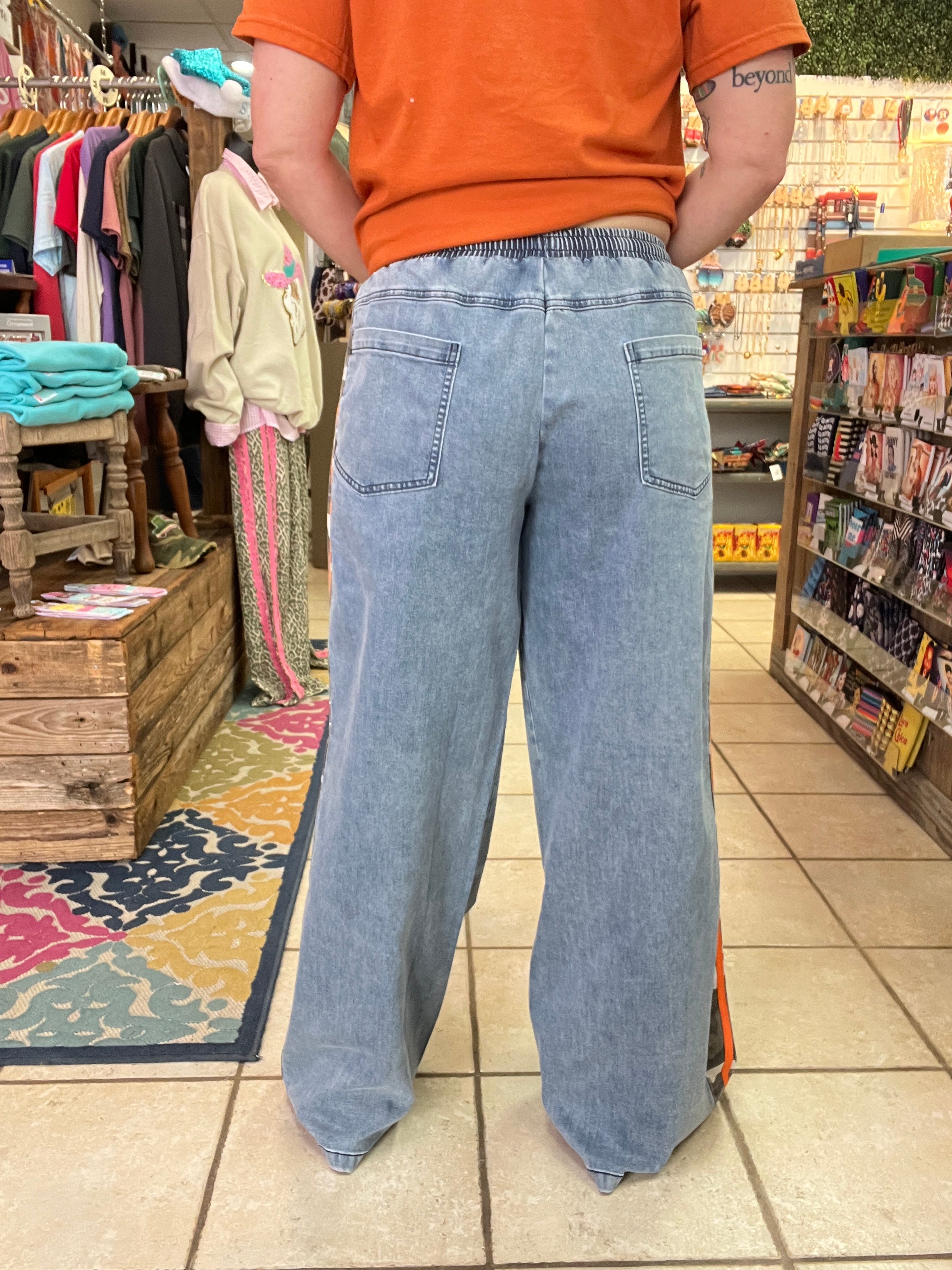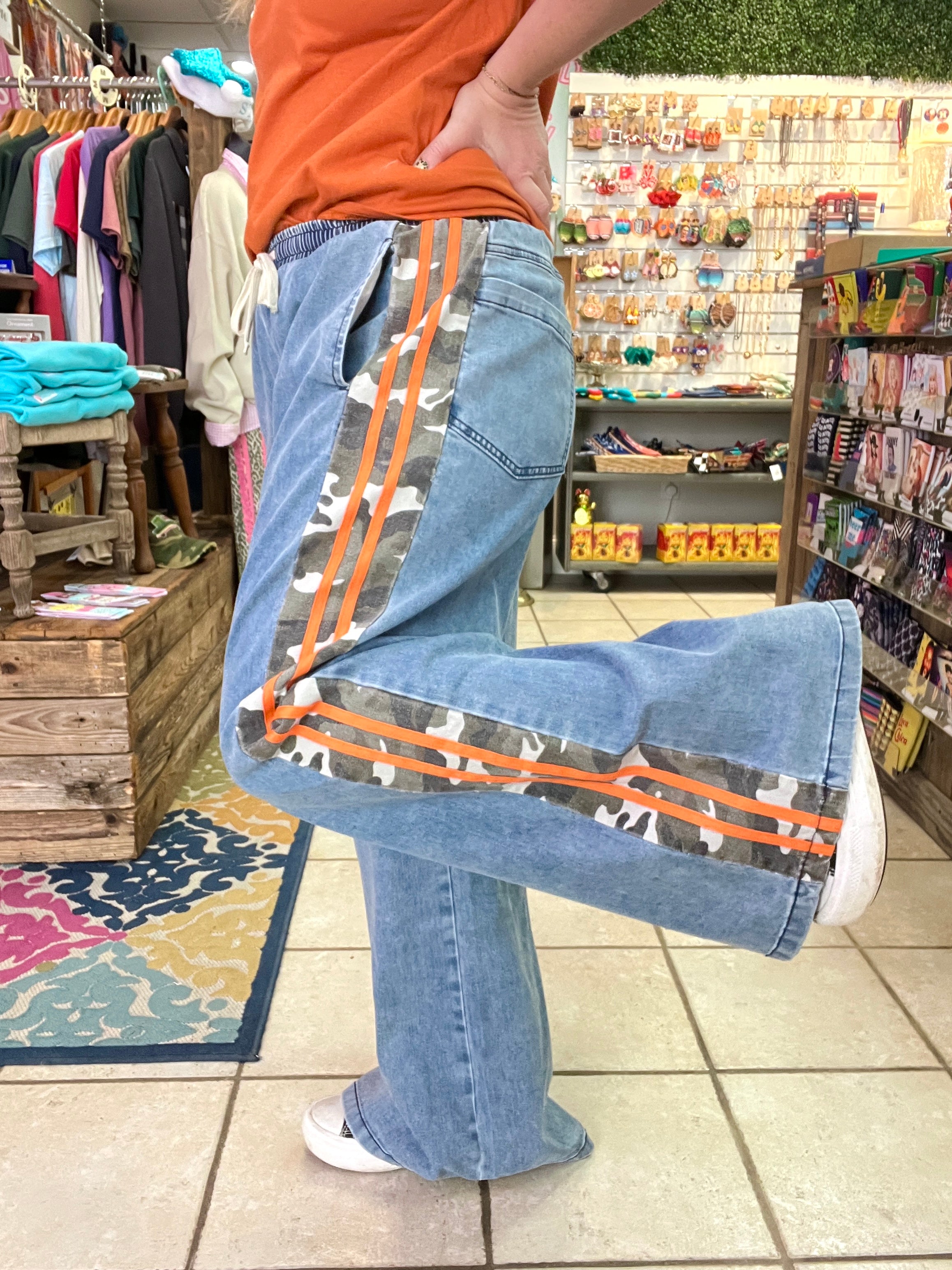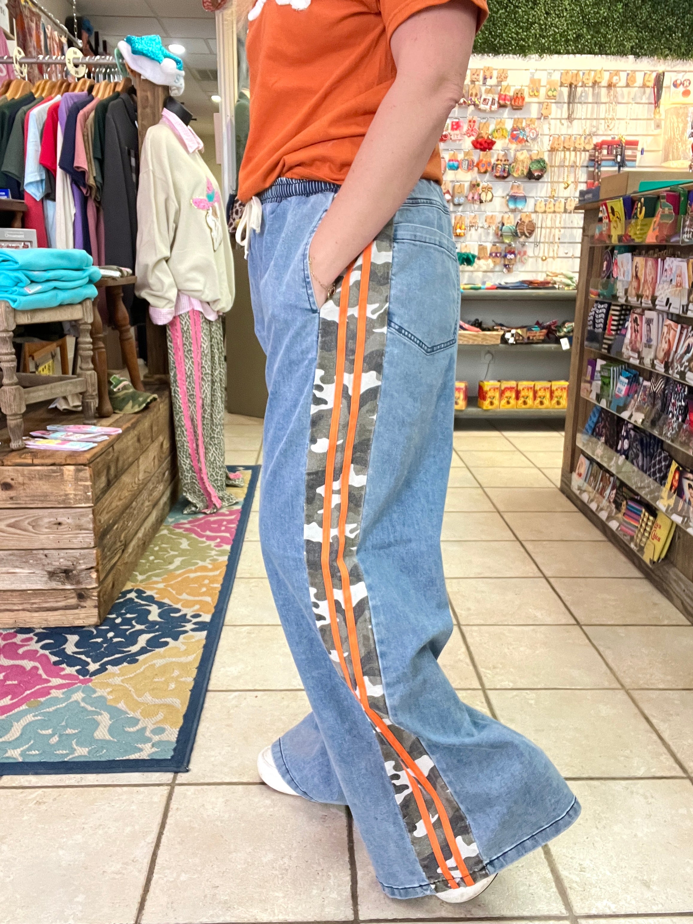 Step up your casual-cool game with our Urban Camo Track Pants. Crafted in soft, comfortable denim with an elastic waistband and drawstring, these pants feature a bold camo print with vibrant orange side stripes for a sporty, street-ready edge.