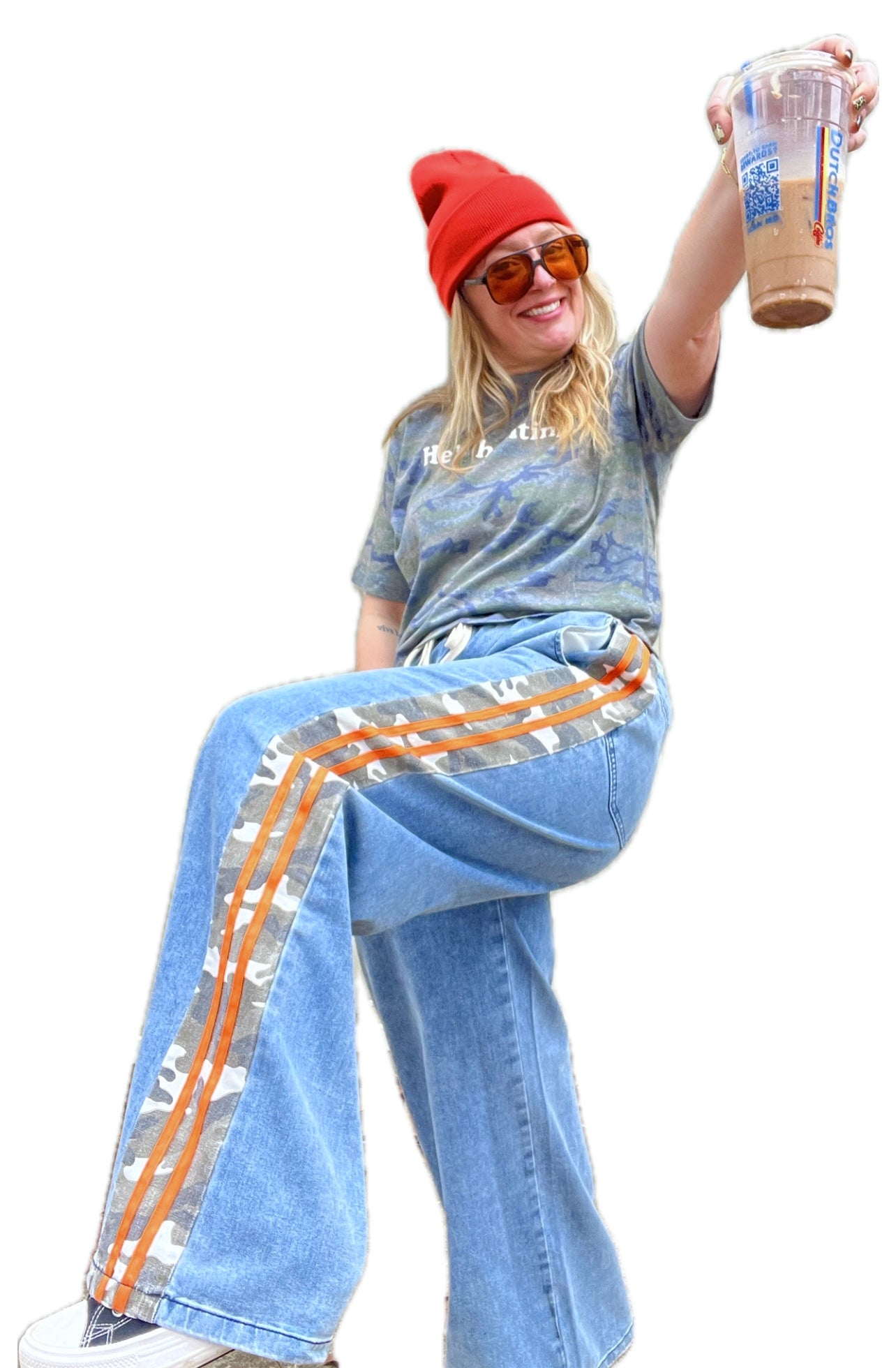 Bold camo print with orange side stripes