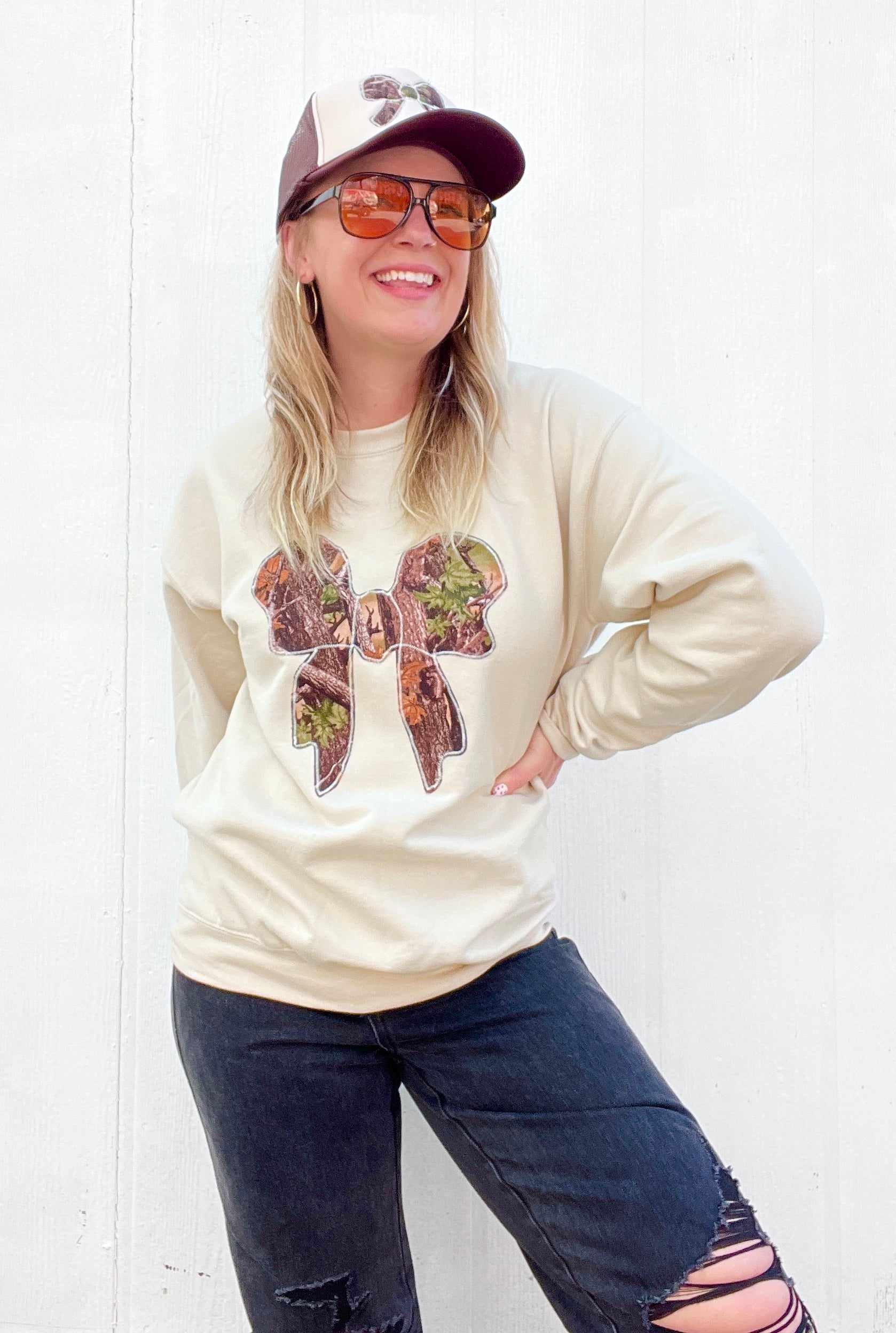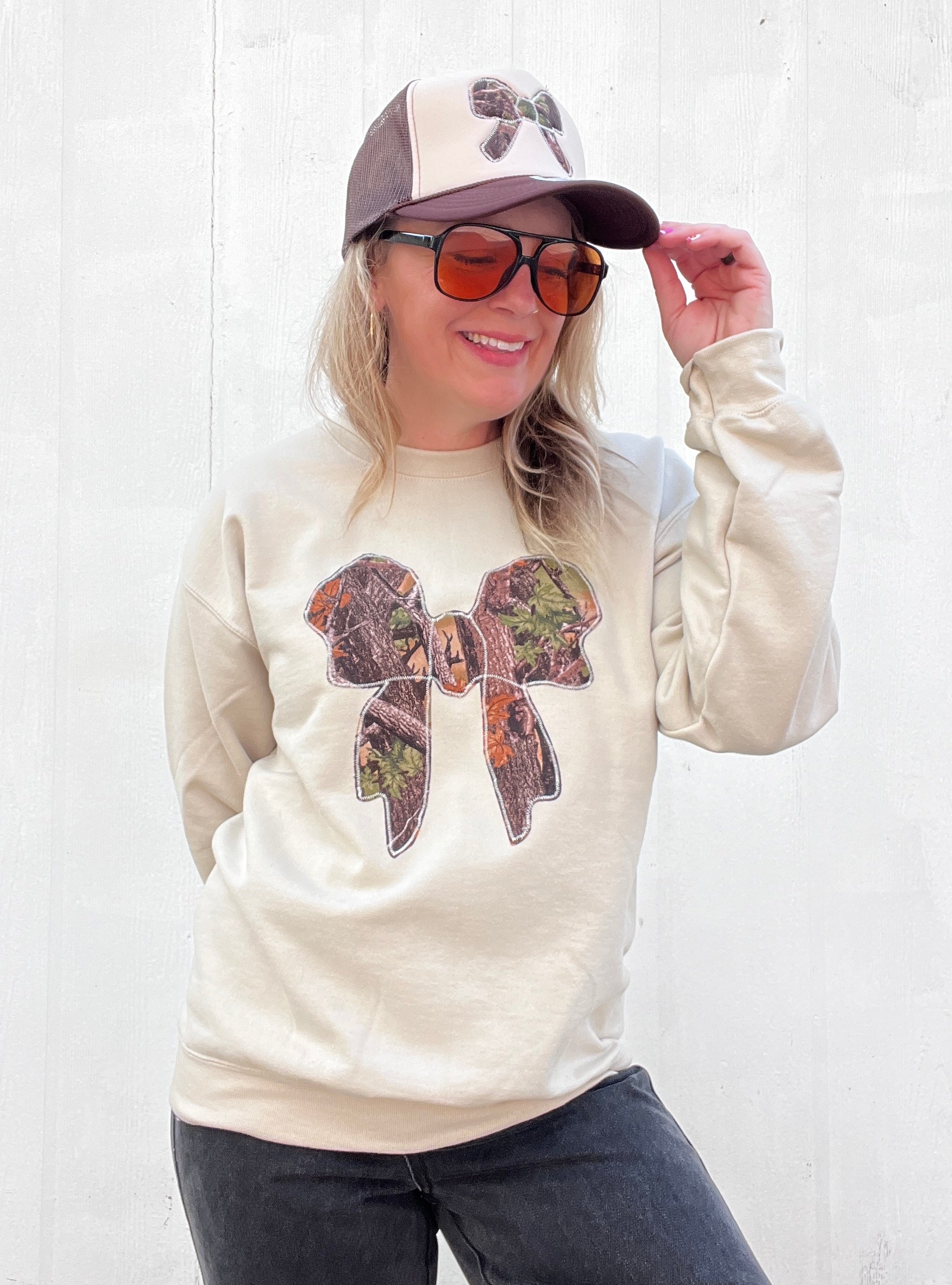 The pullover pictured has our Bow on a tan pullover.