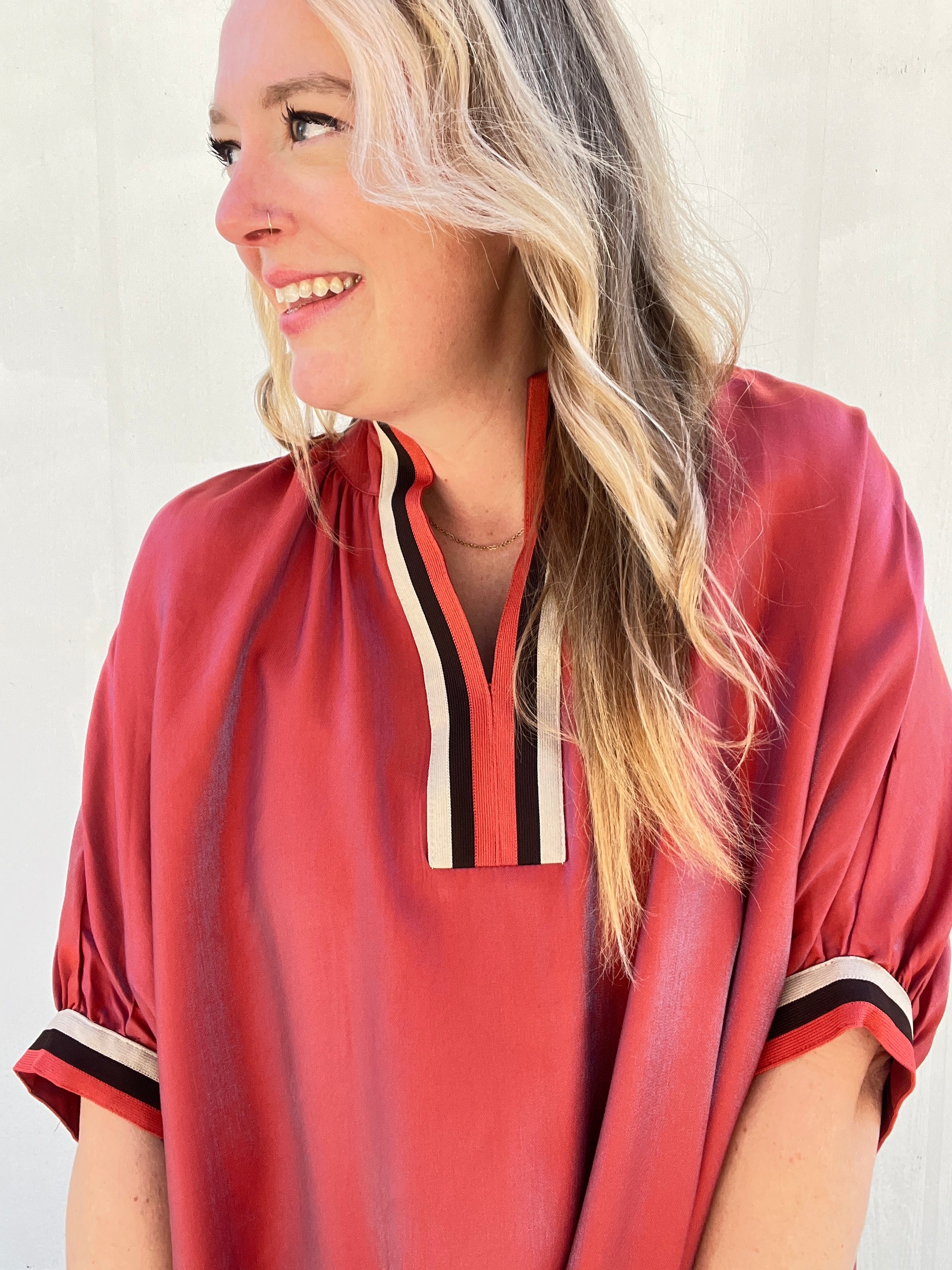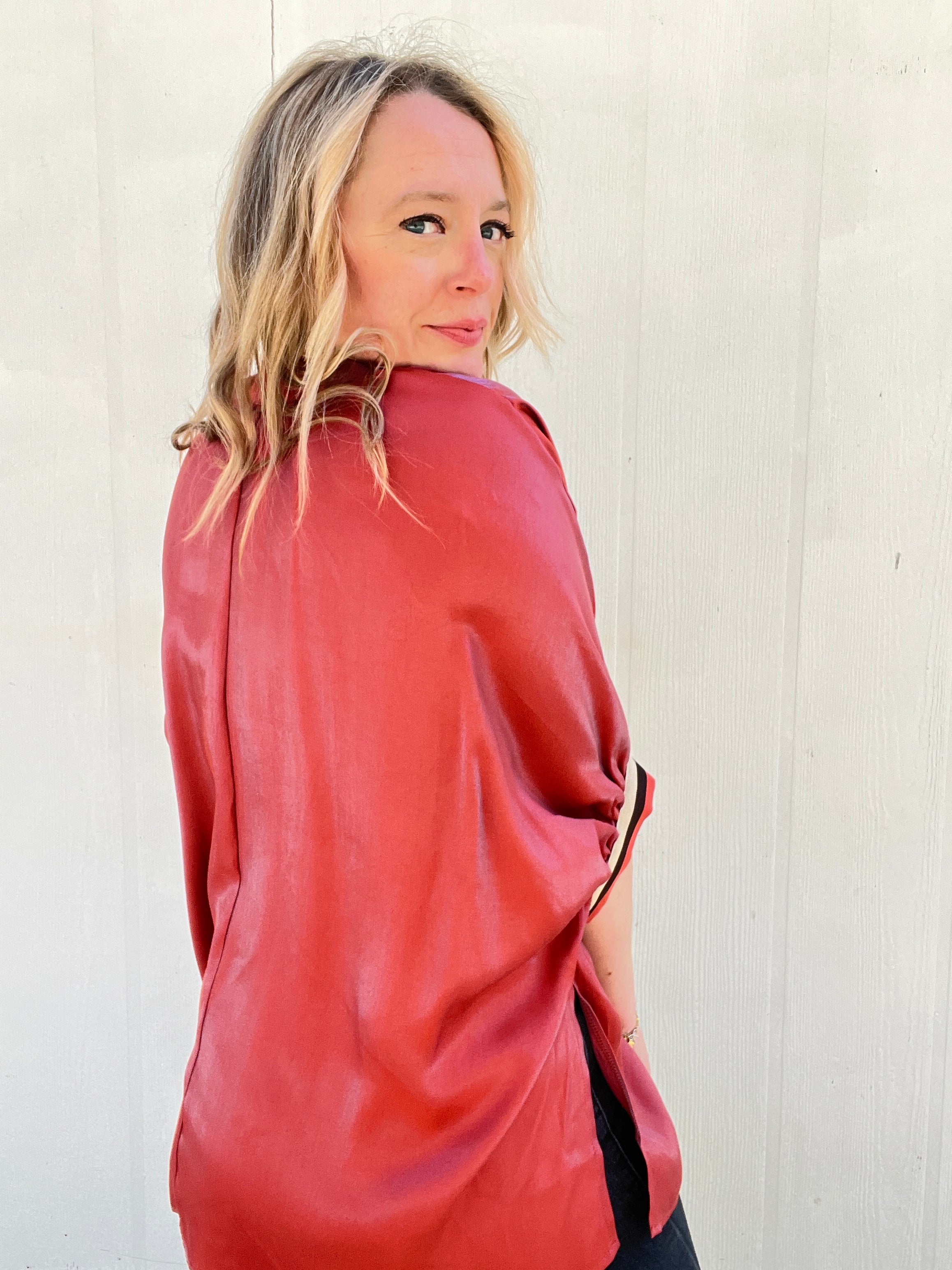 Soft shimmer meets effortless elegance in our Shimmer Luxe Rose Top. Designed in a beautiful metallic rust-rose hue, this flowy silhouette drapes gracefully while catching the light in all the right ways. The 3/4 sleeves feature unique statement cuffs, perfectly complemented by a matching neckline for a polished, luxe finish.