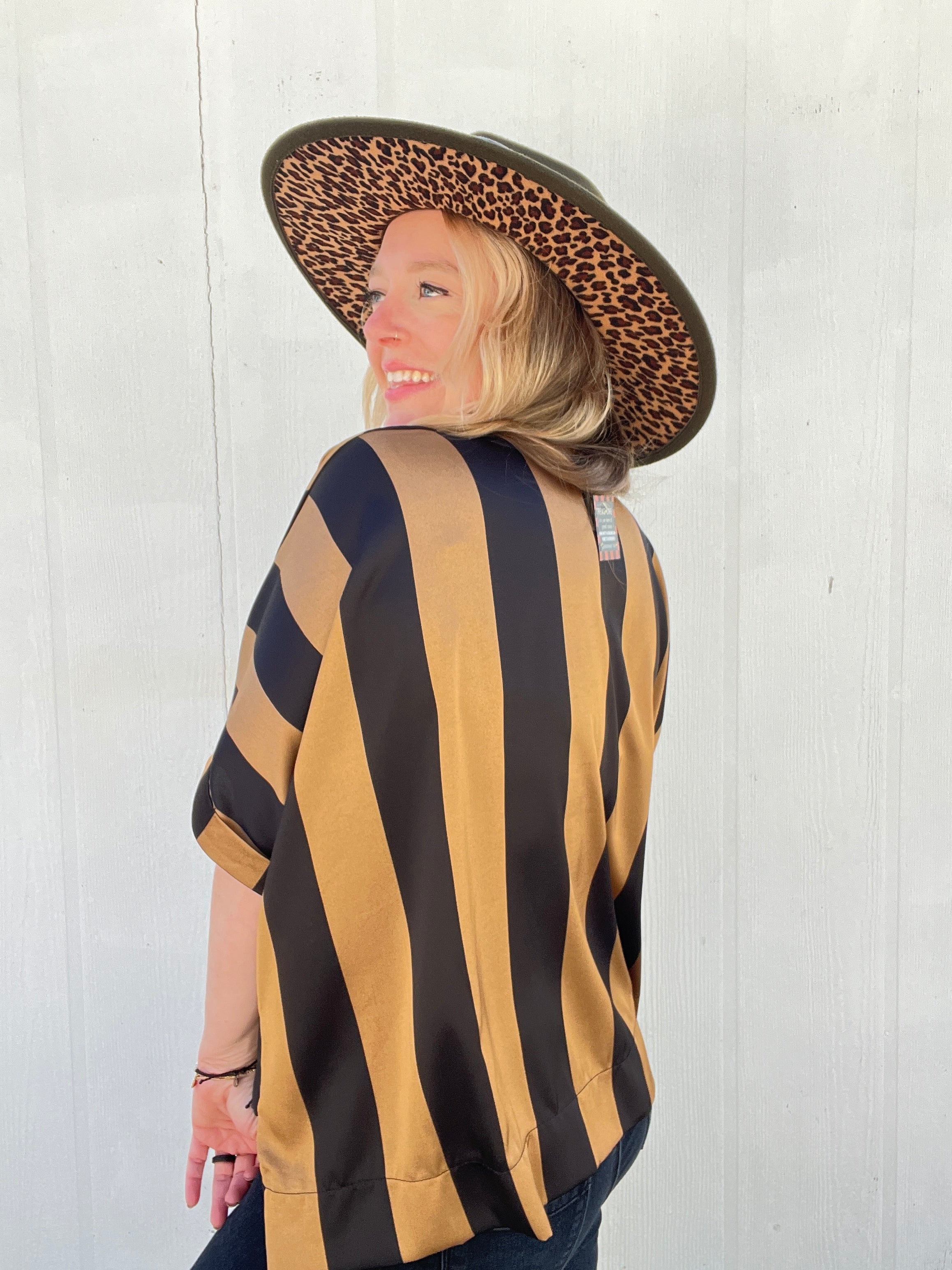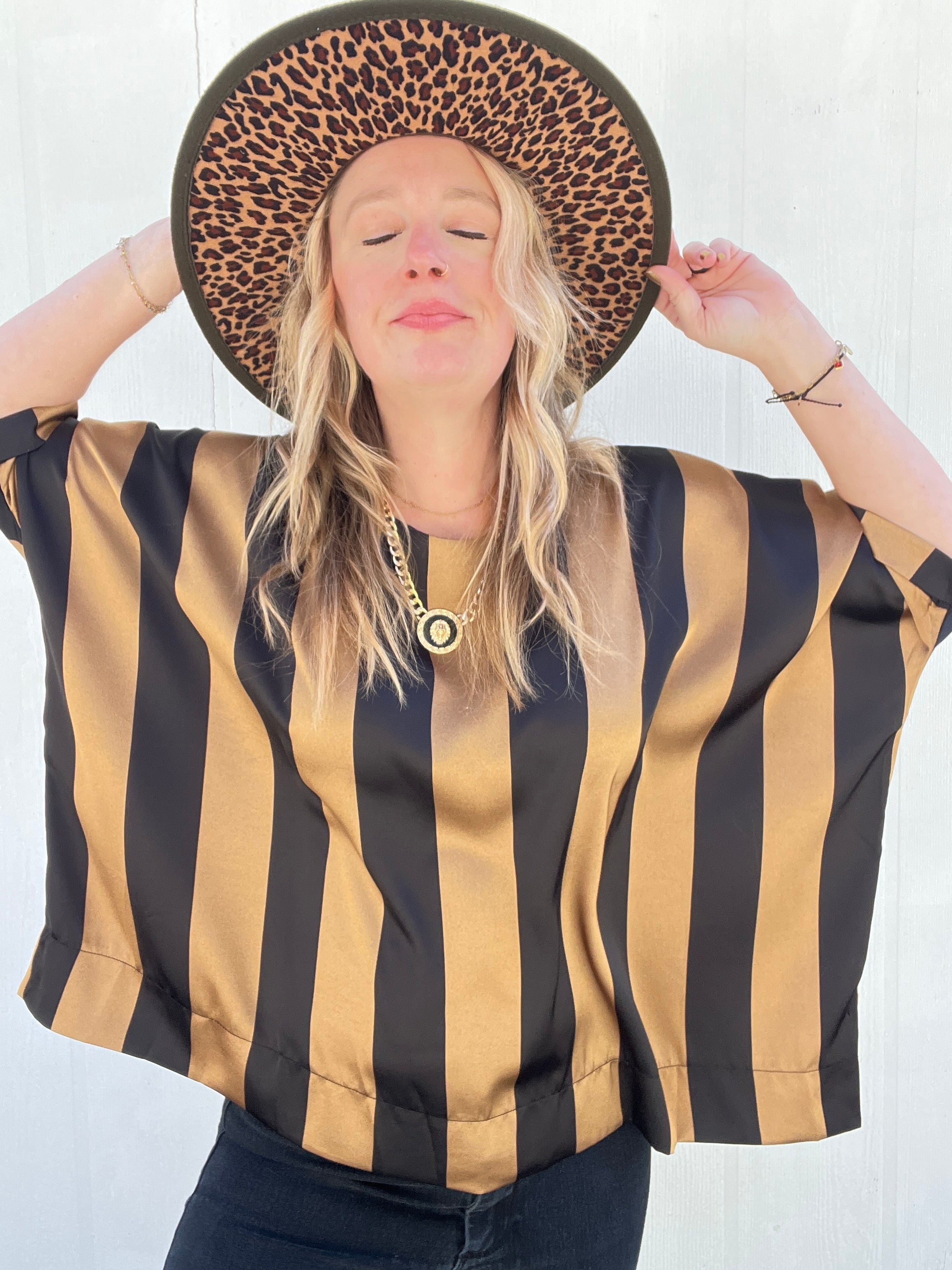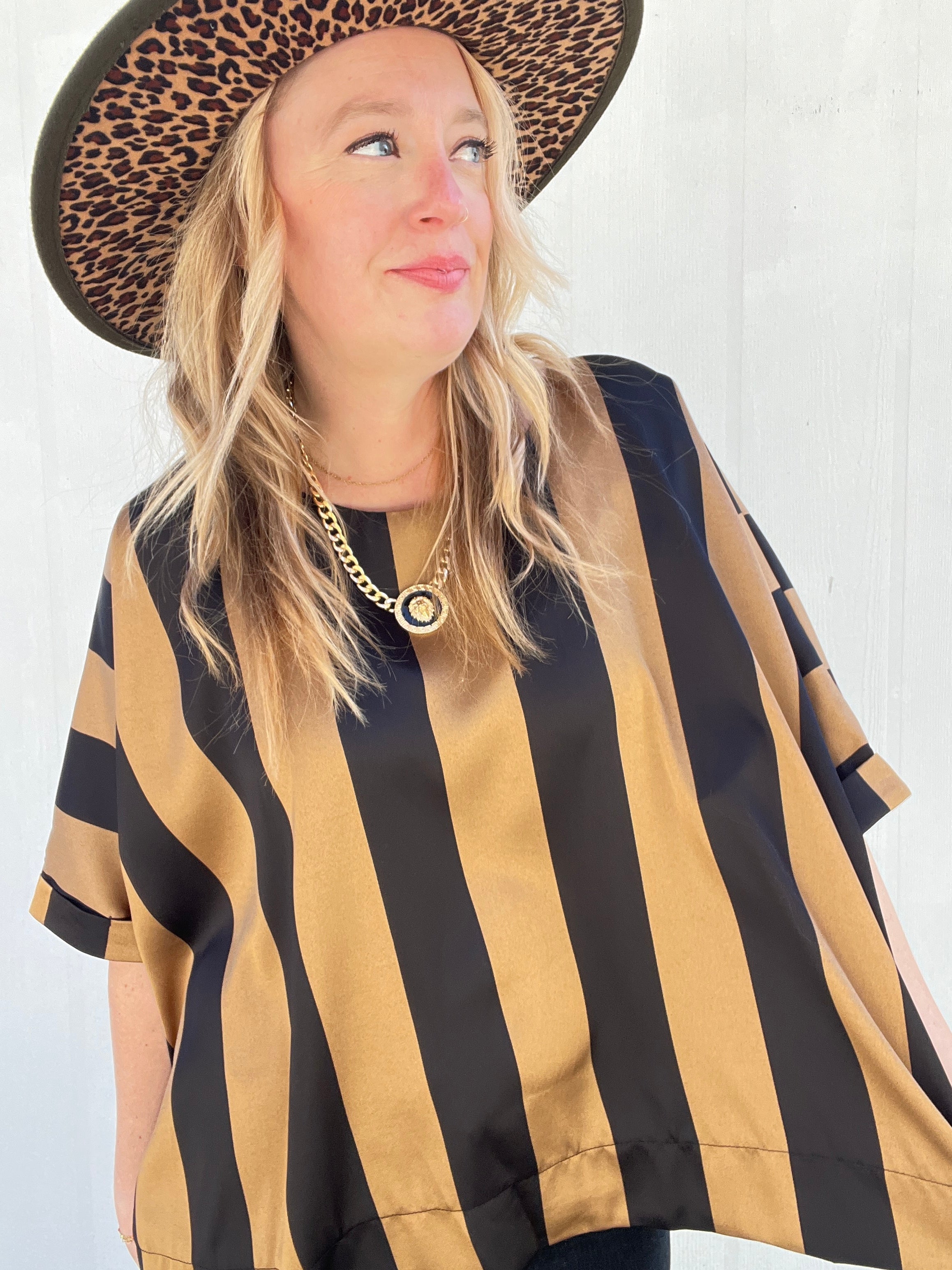 Effortlessly elevated, our Striped Luxe Top features sleek black and gold vertical stripes that create a flattering, elongated look with just the right touch of shimmer. The flowy, boxy silhouette drapes beautifully, making it comfortable, polished, and easy to style from day to night.
