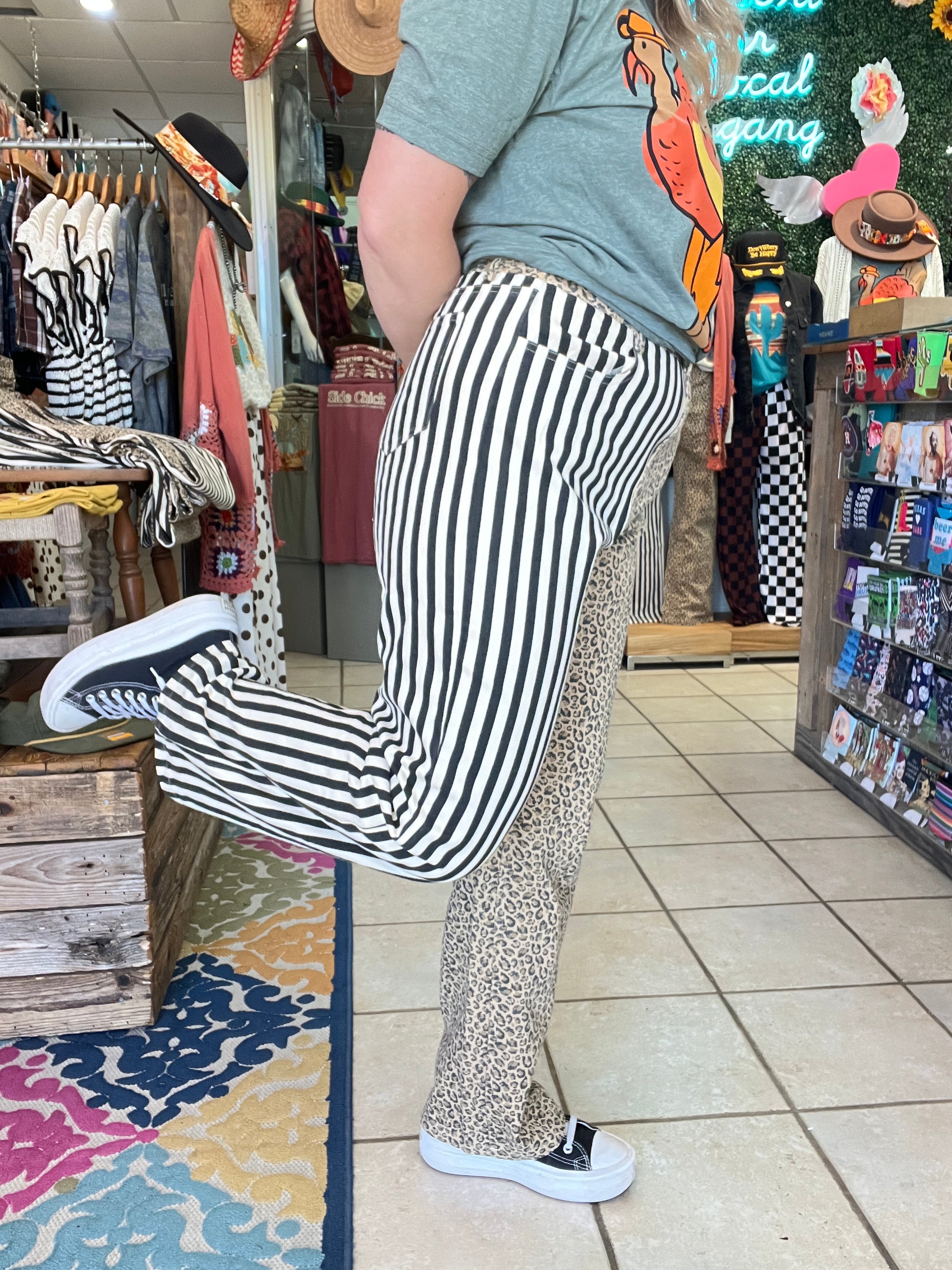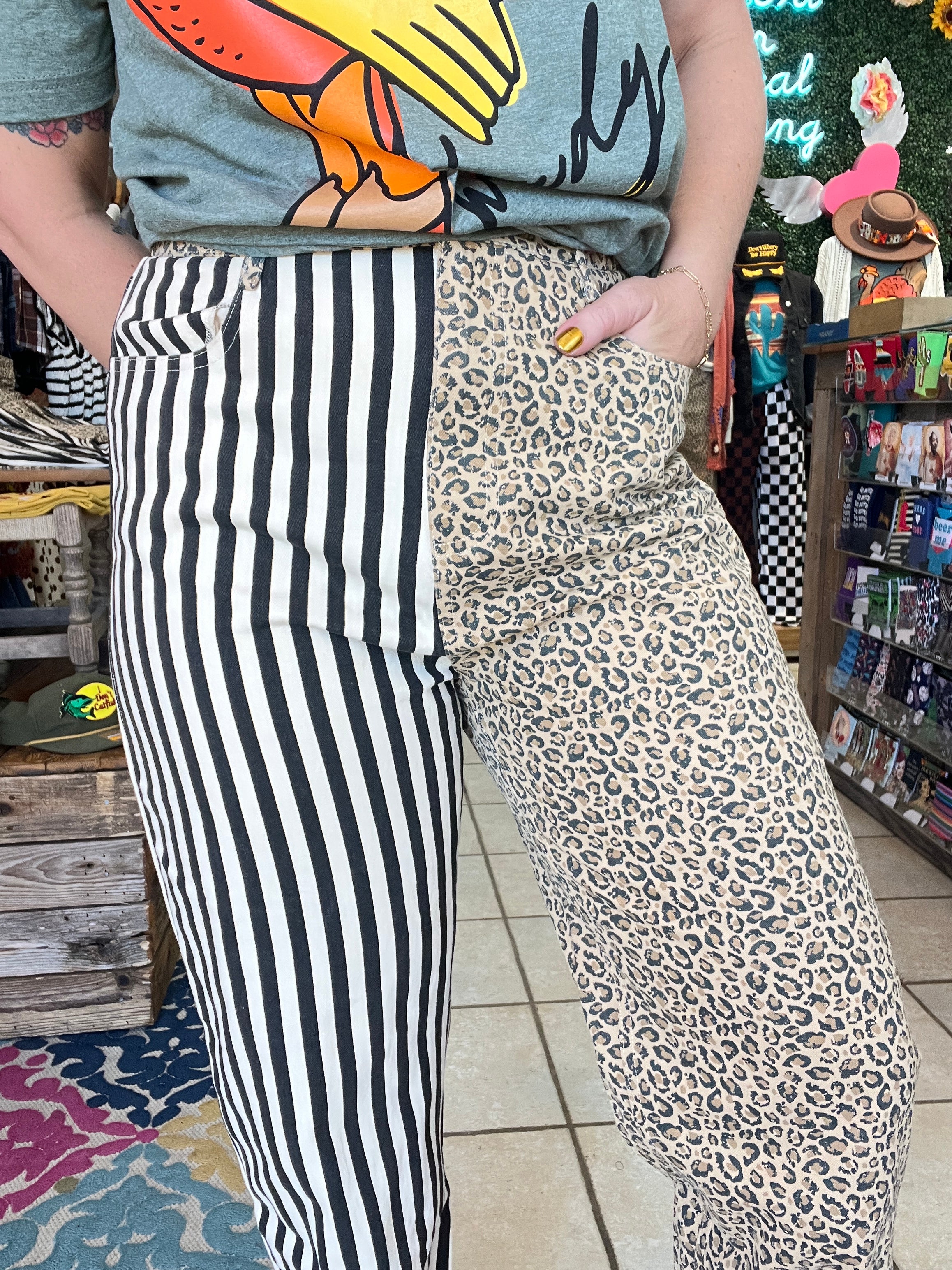 Turn heads and own your bold side with the Fierce Fusion Jeans. These statement-making denim pants blend two striking prints—sleek black and white vertical stripes on one leg and wild leopard on the other—for a look that’s unapologetically confident. Crafted with a flattering high-rise fit and a hint of stretch for all-day comfort, these jeans pair perfectly with a simple tee or a chic blazer. Whether you’re hitting the town or styling up your everyday look, these jeans bring fierce energy to every outfit.