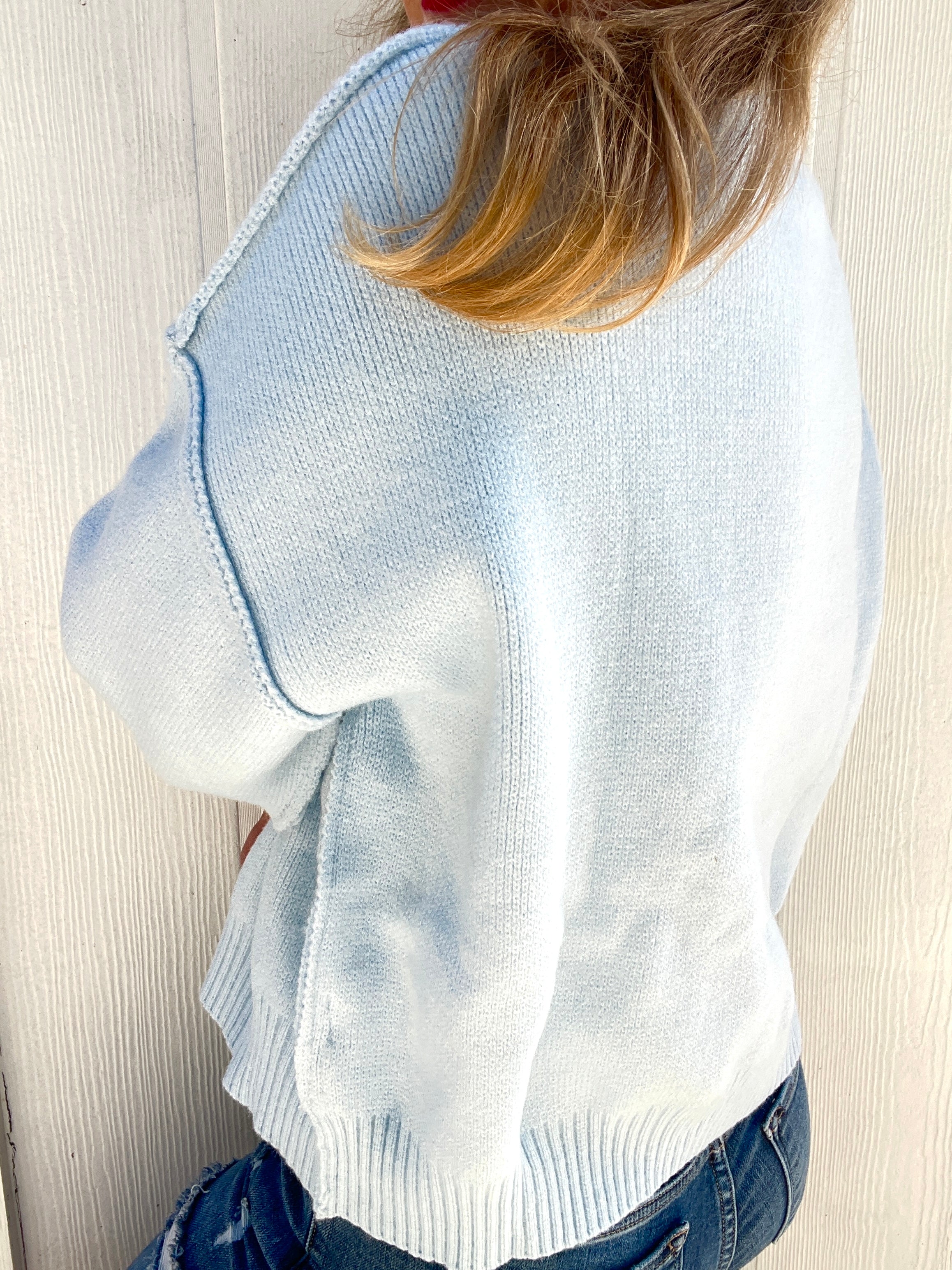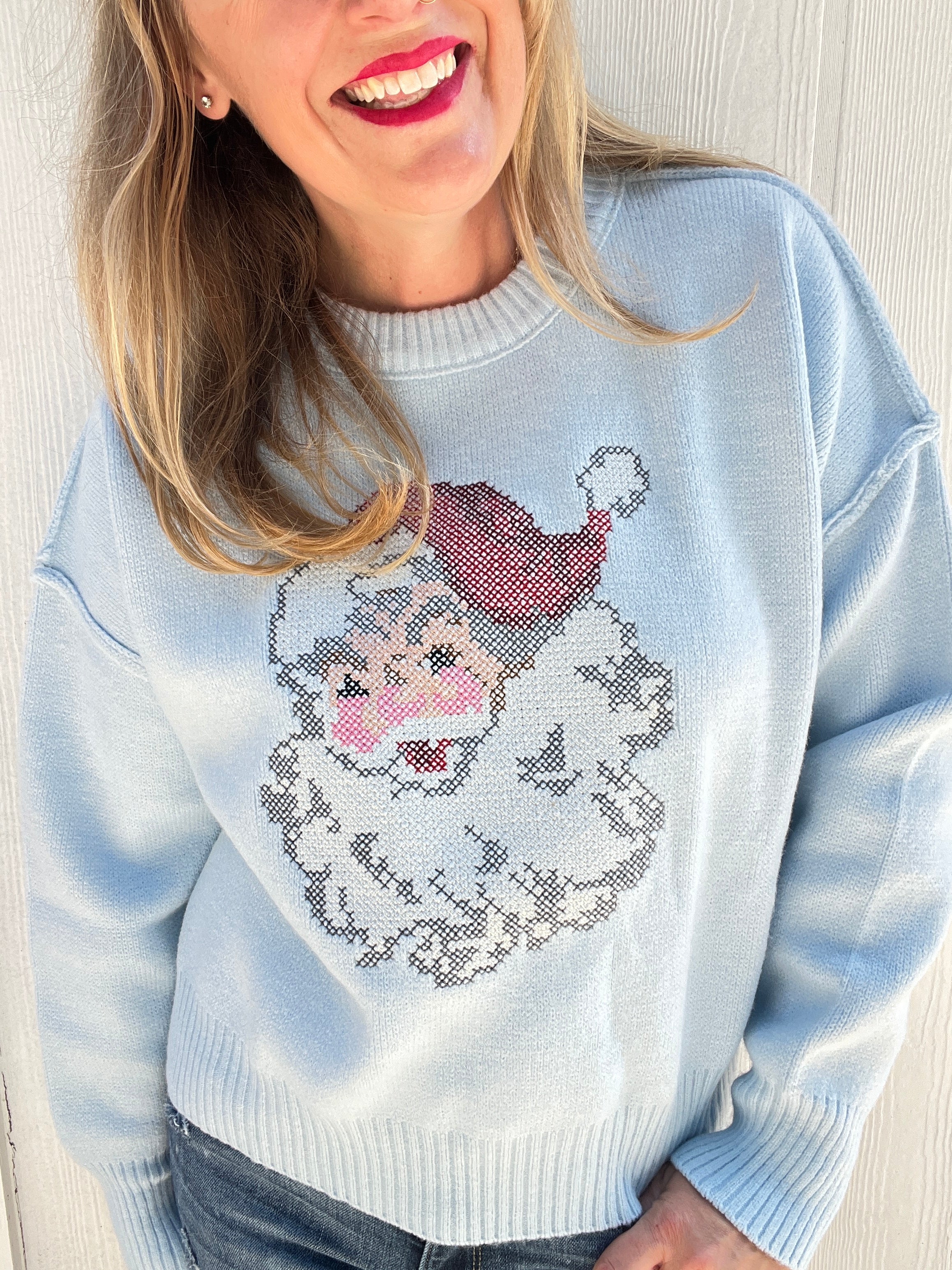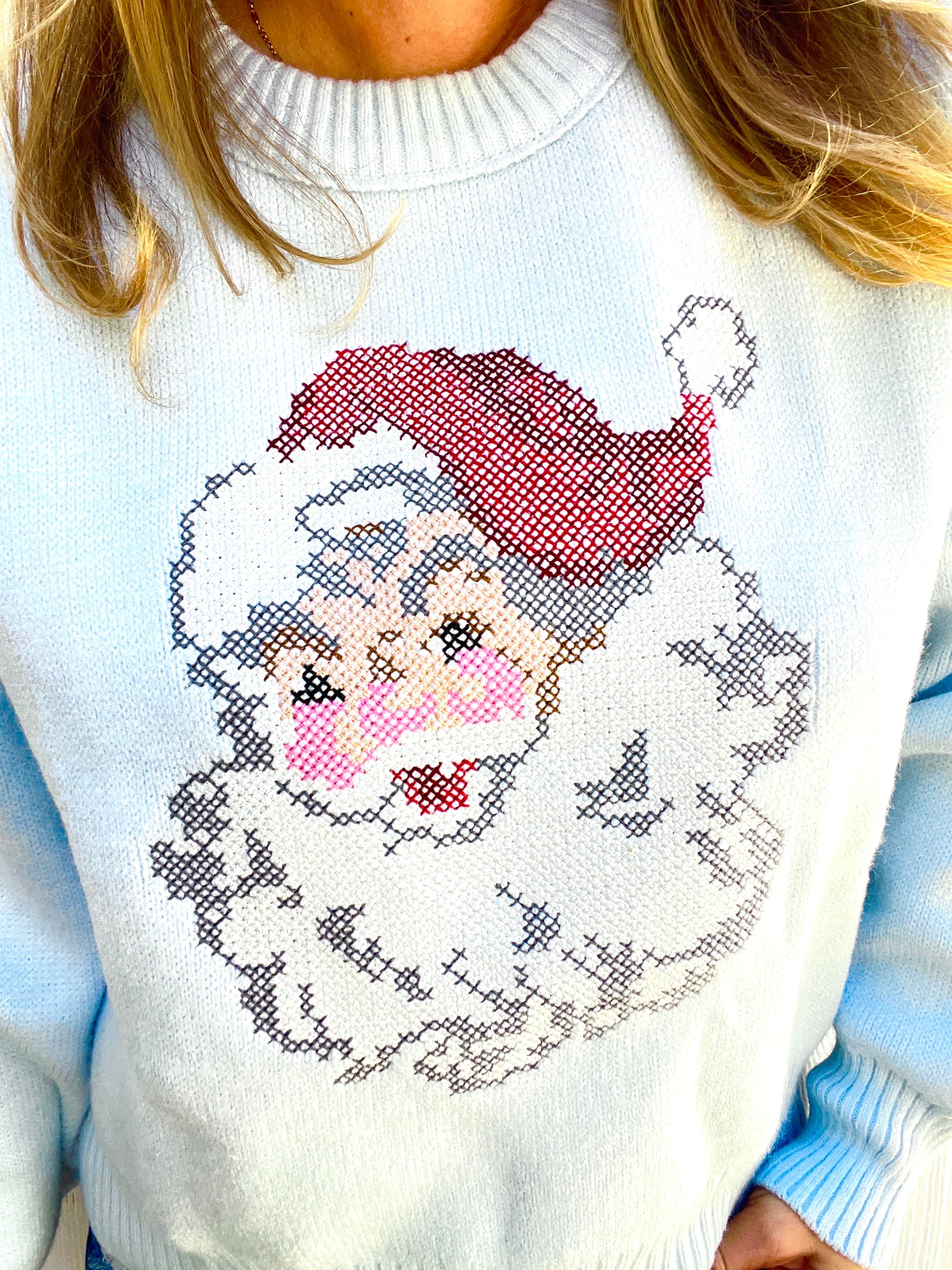 Bring a touch of nostalgic cheer to your winter wardrobe with The Frosted Santa Baby Cropped Sweater. This baby blue beauty blends vintage holiday charm with a fresh, modern silhouette. The classic embroidered Santa design gives off a retro, storybook feel—like something straight out of your favorite cozy Christmas memories—while the cropped fit and soft knit fabric keep it effortlessly on-trend. Perfectly balanced between timeless and playful, this sweater pairs beautifully with high-waisted denim or a festive skirt for a look that’s merry, bright, and totally boutique chic.